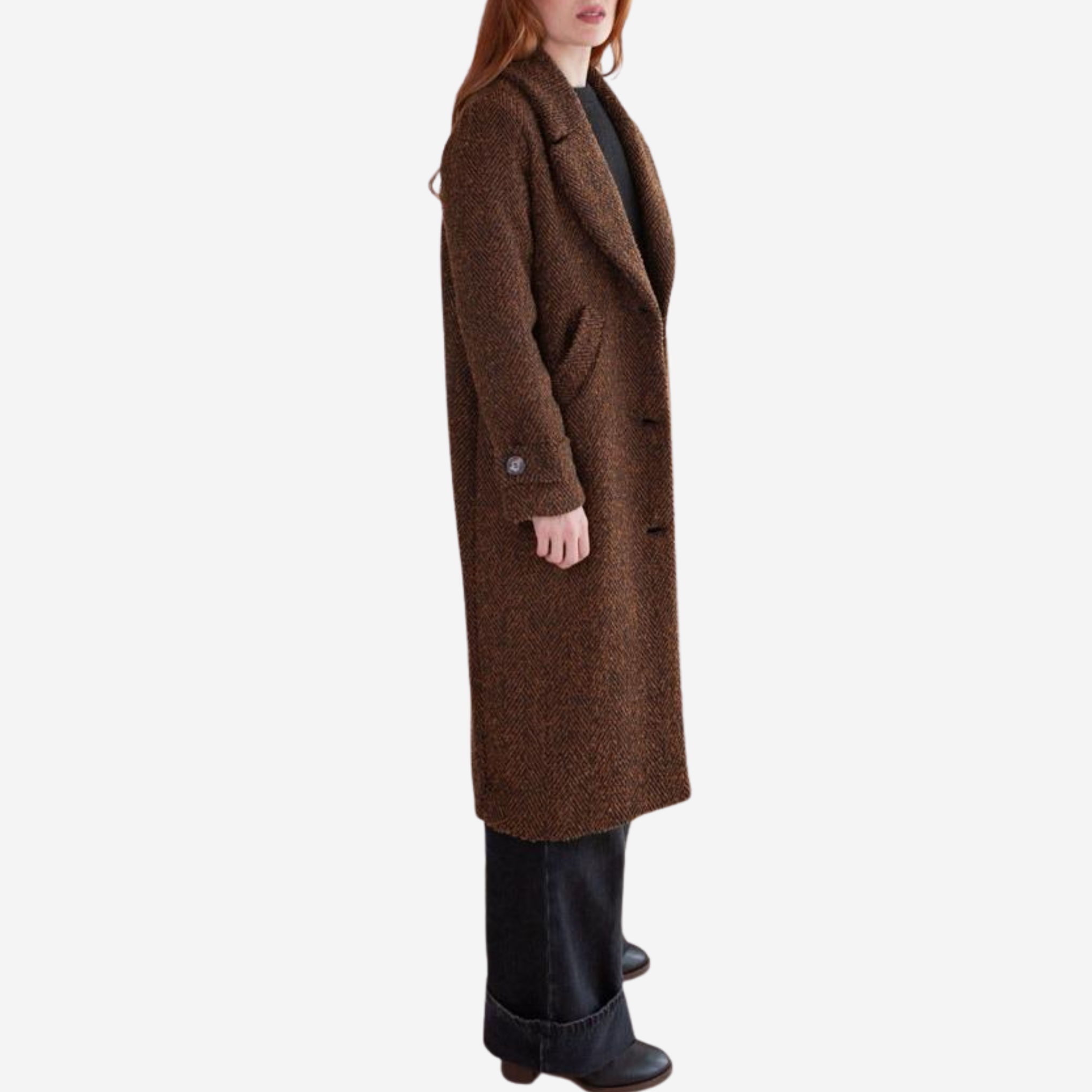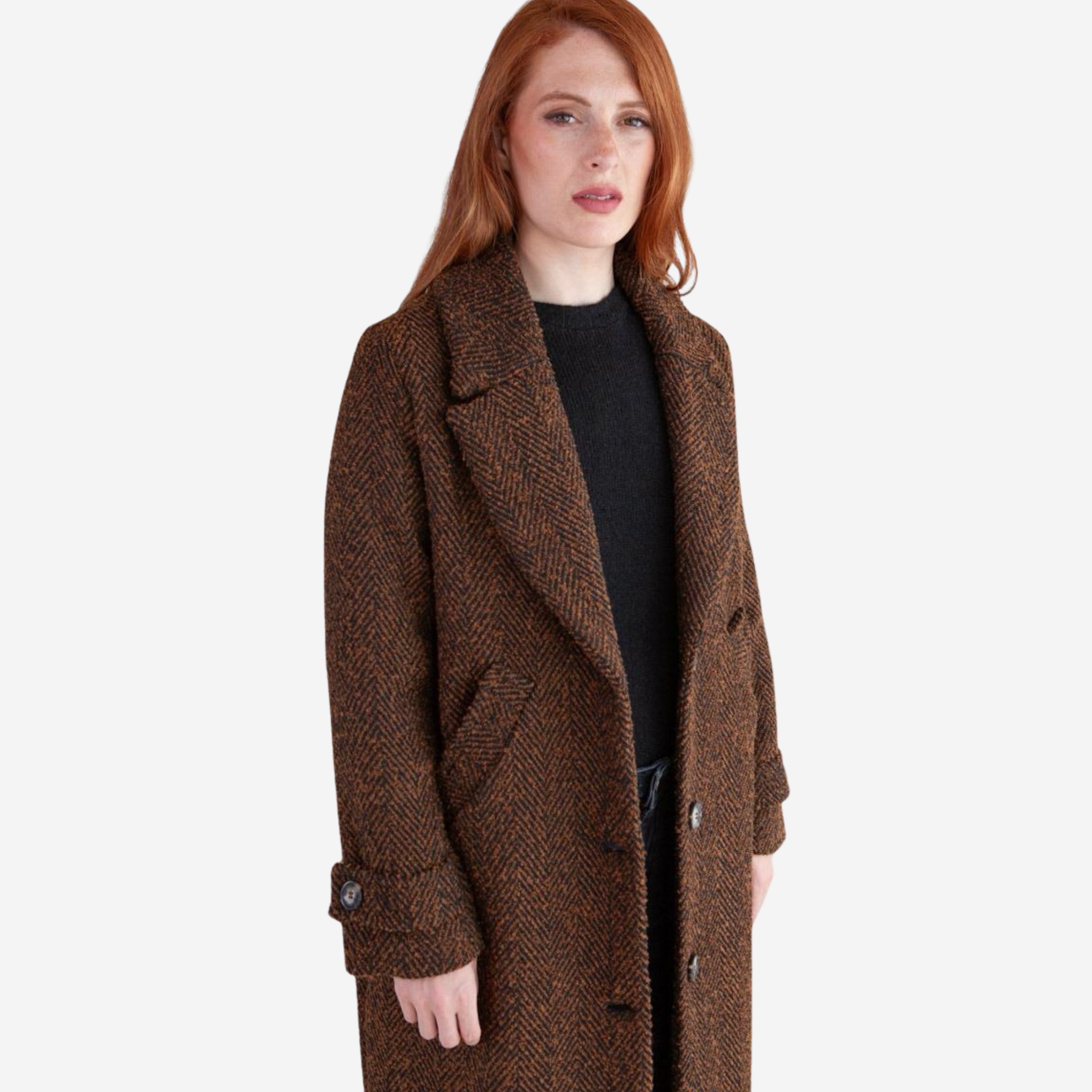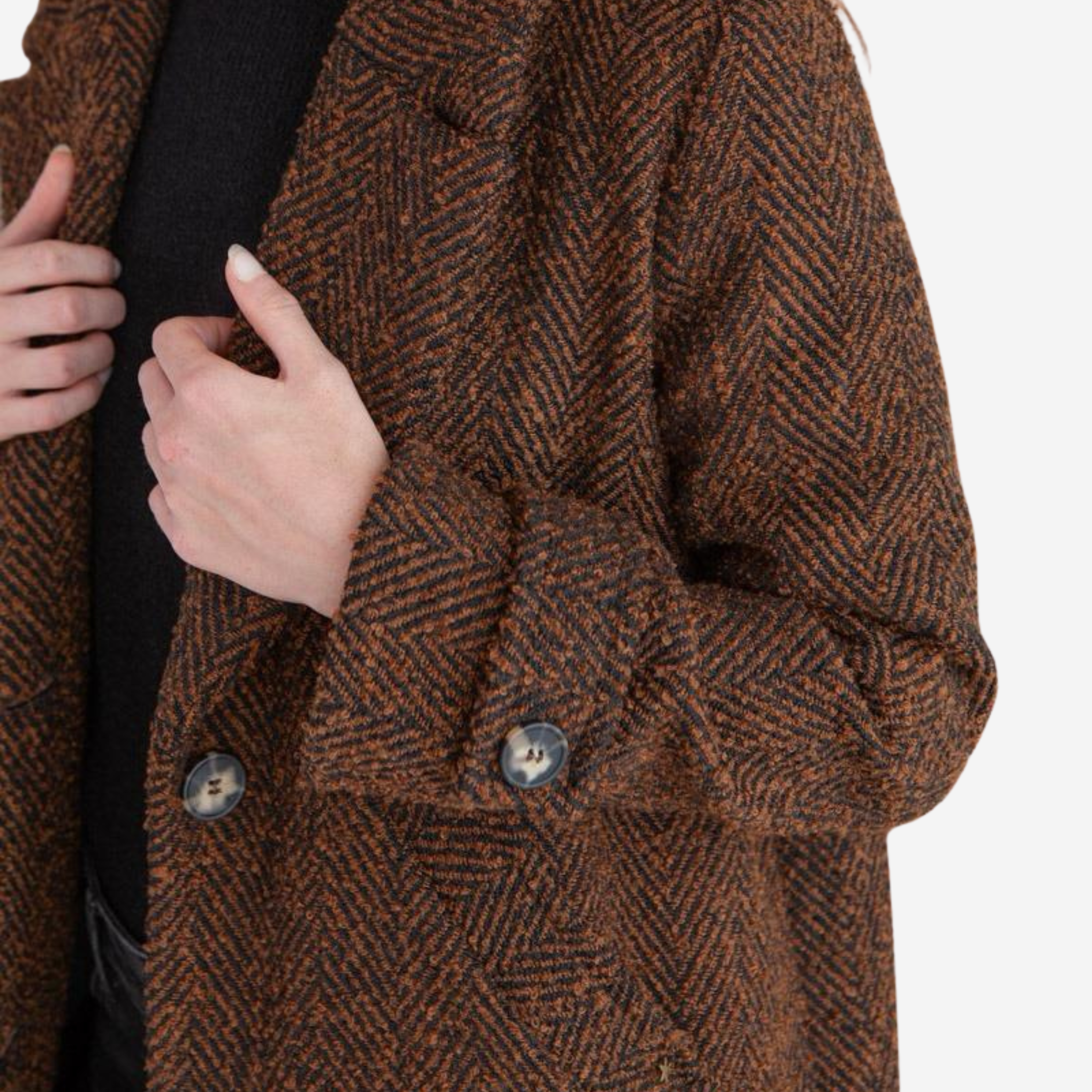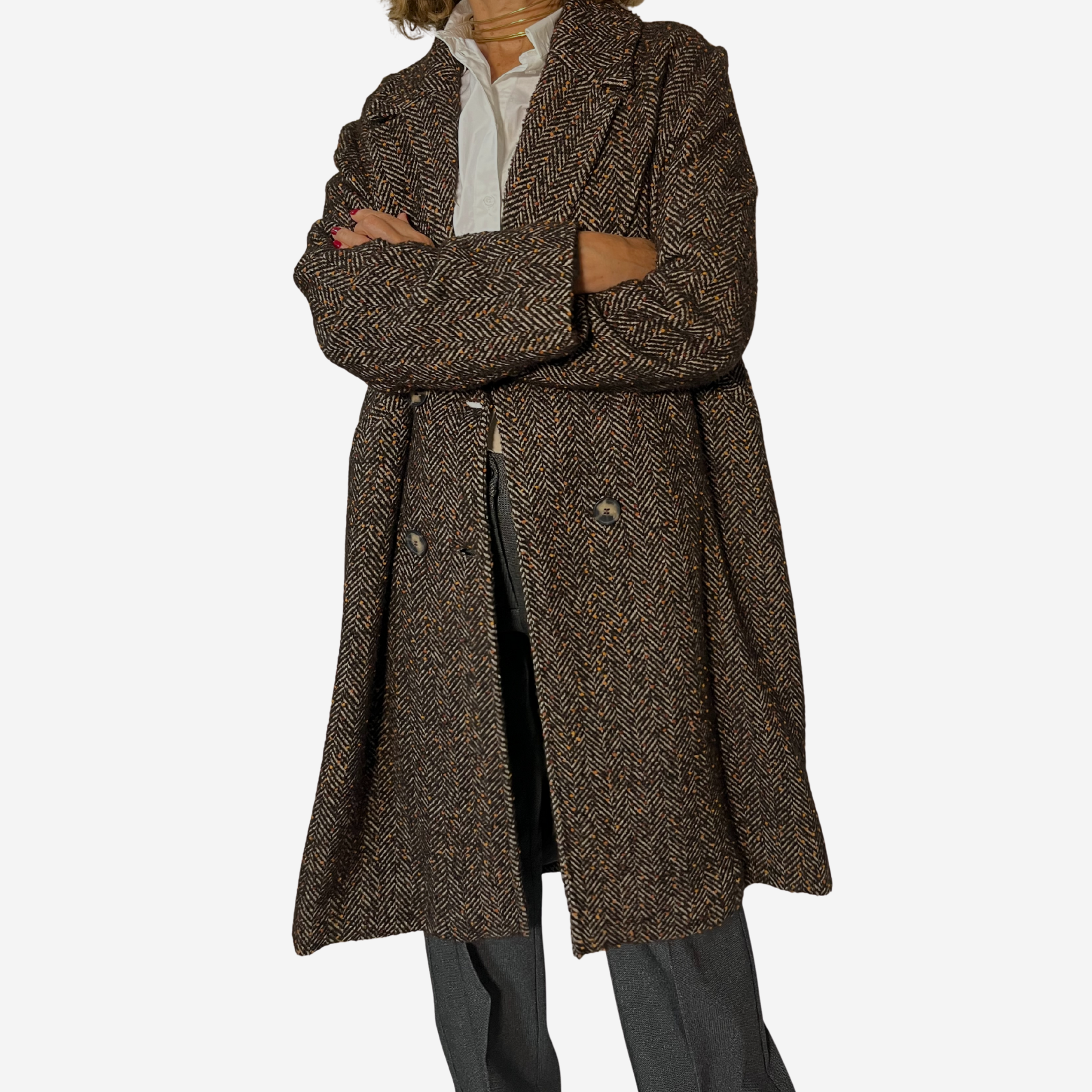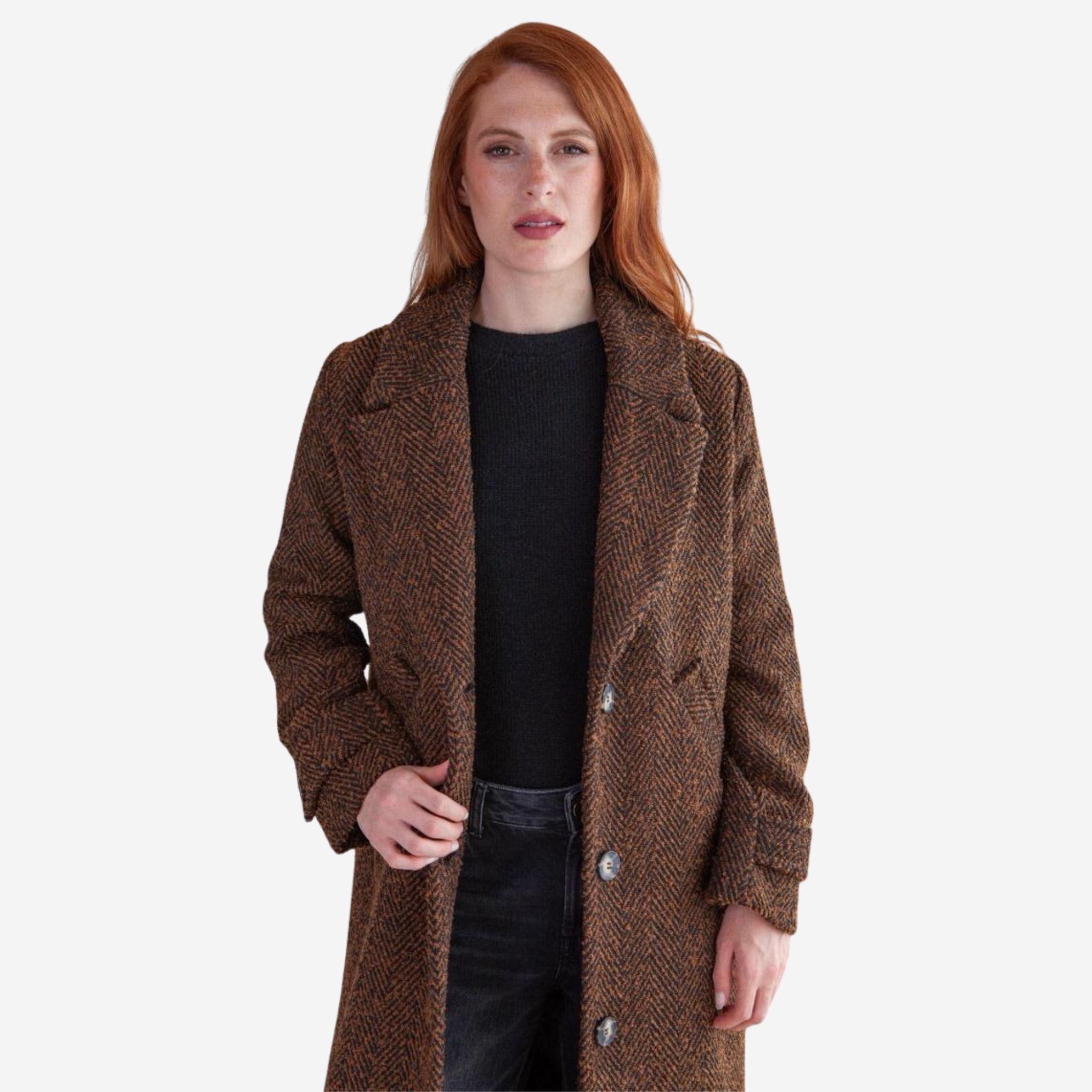 Abrigo de espiga negro y crudo con detalles en naranja y teja. Bolsillos laterales, cuello pico y cierre con botones. Made in Bilbao.