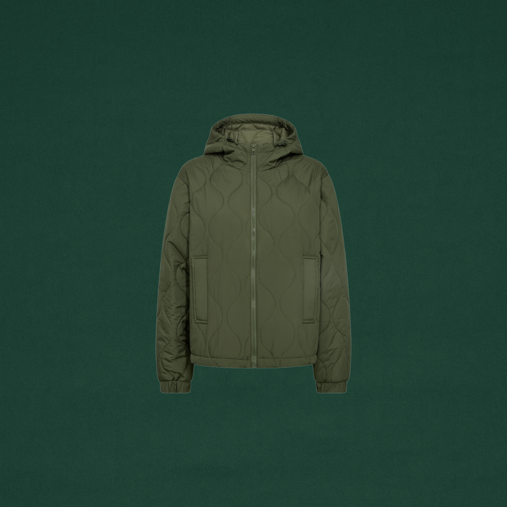 Acolchado color verde con capucha y cuello alto. Cierre con cremallera y bolsillos laterales. Tiene en la cadera goma para ajustar si se quiere.