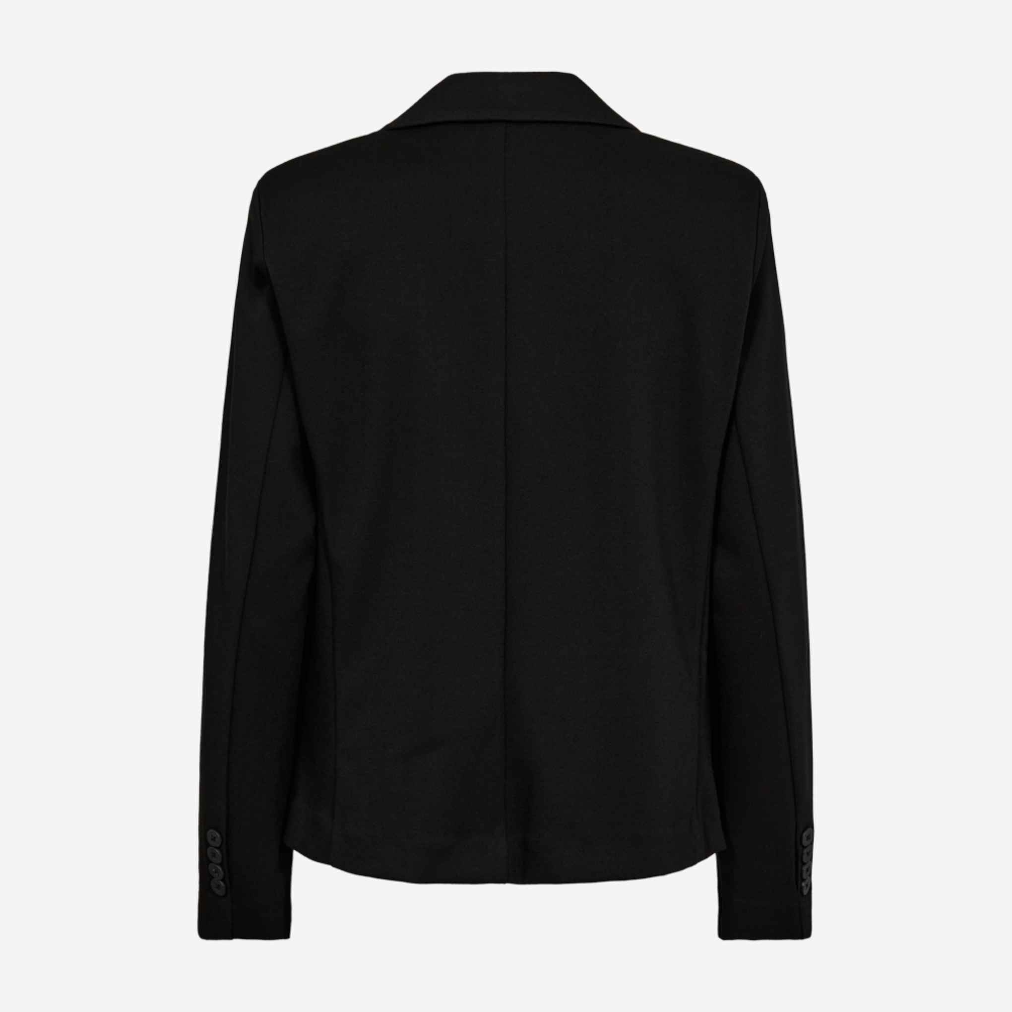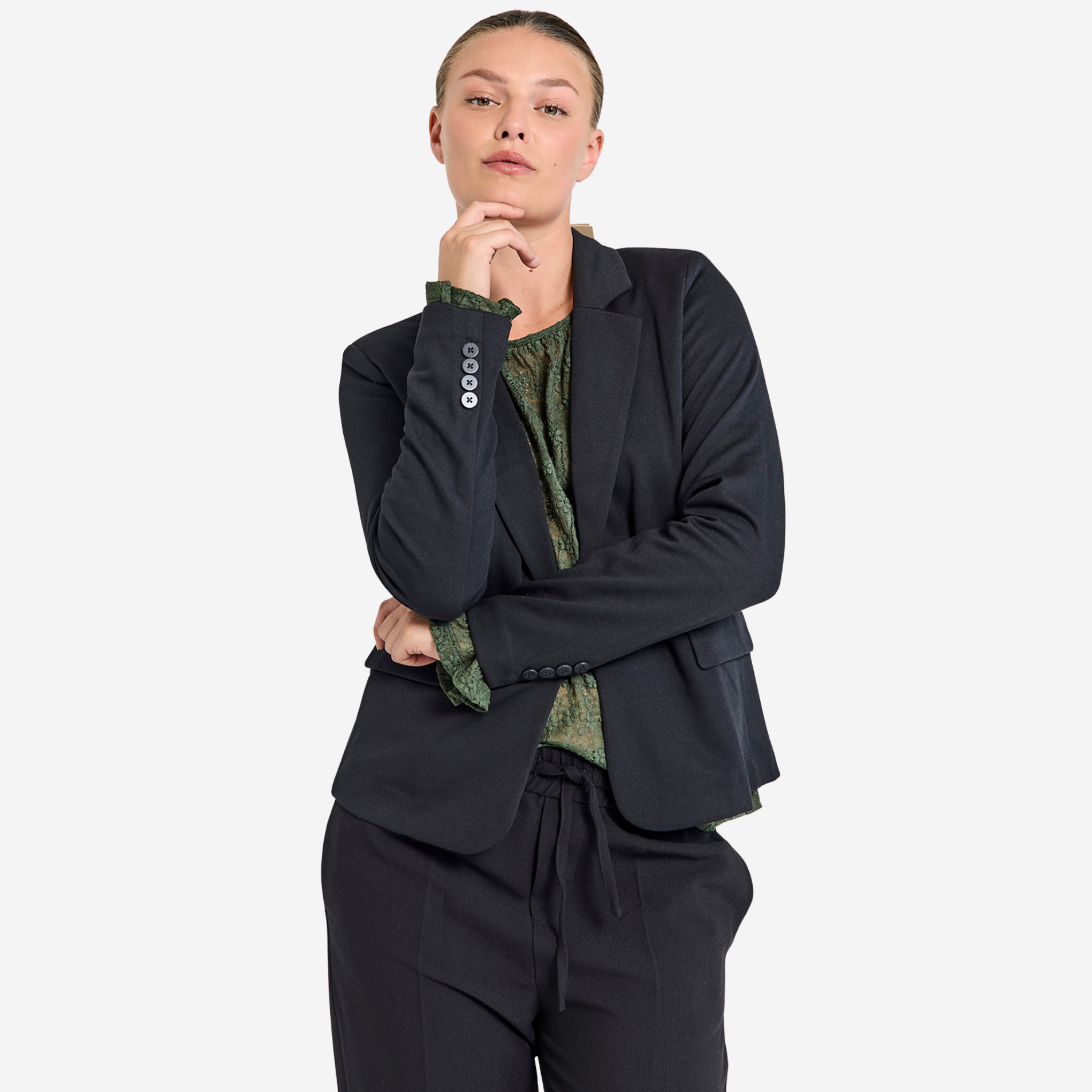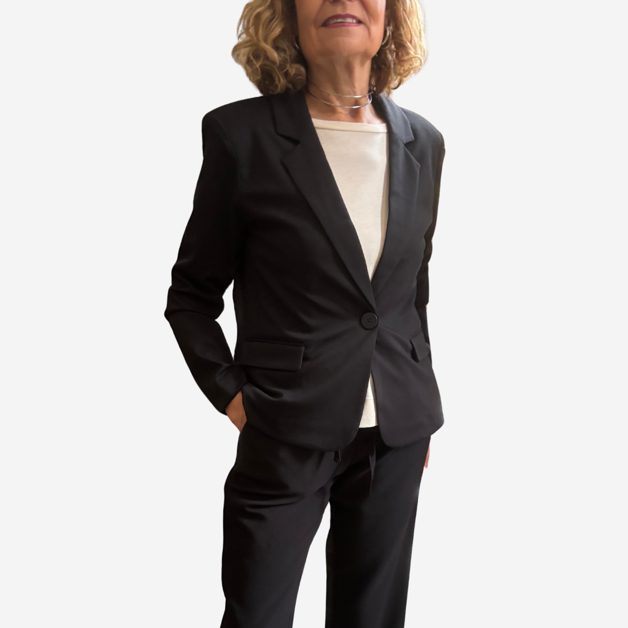 Americana de color negro. Bolsillos con tapeta y cierre con botones.