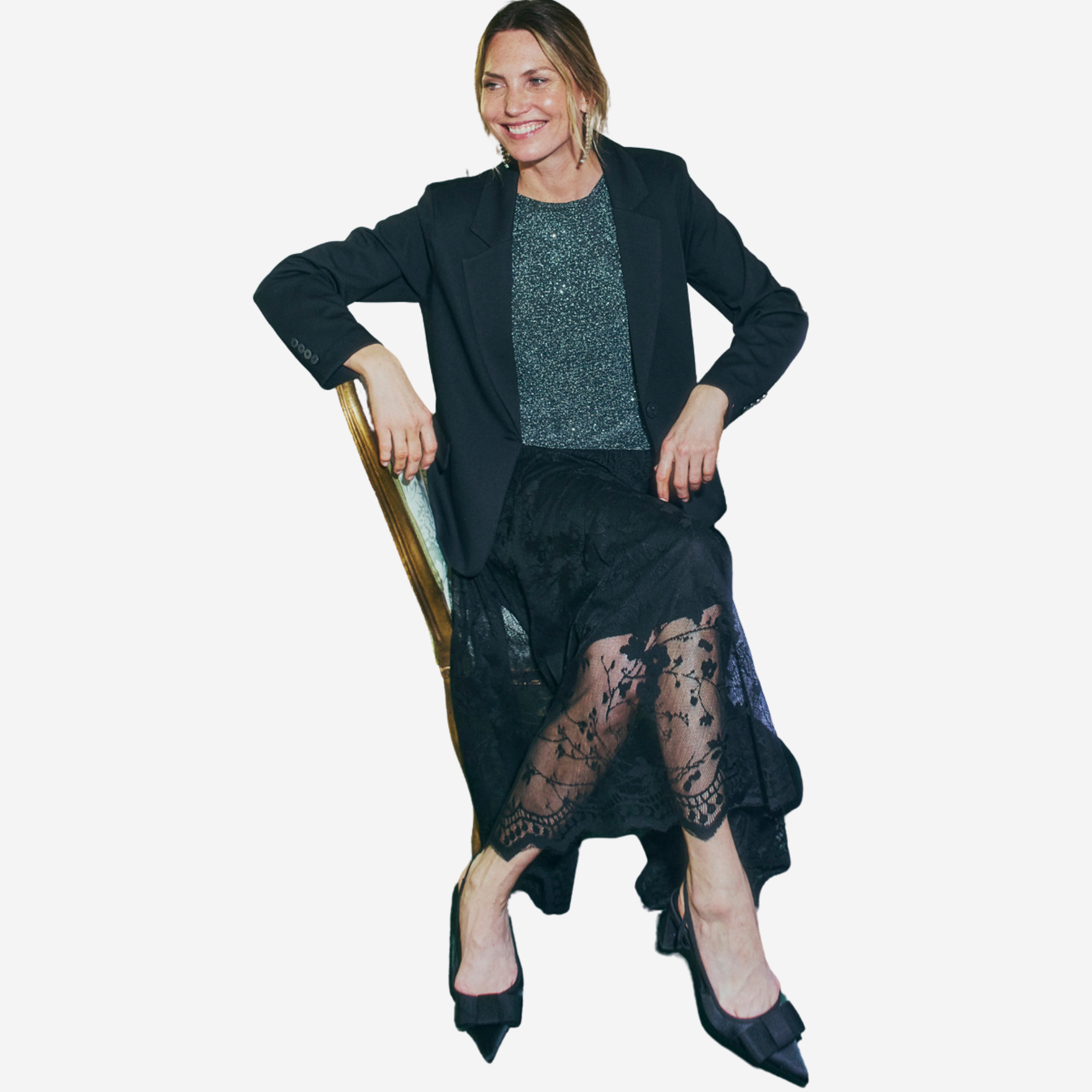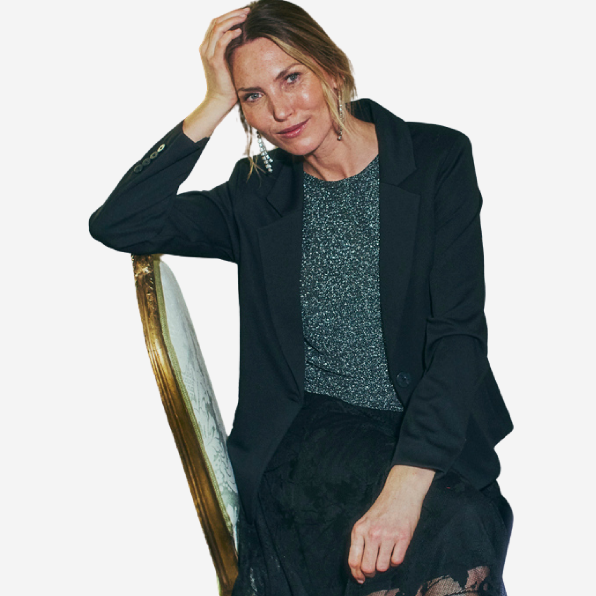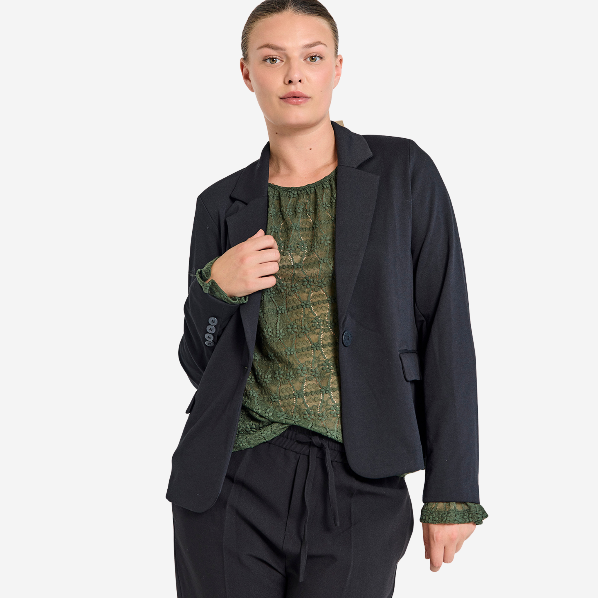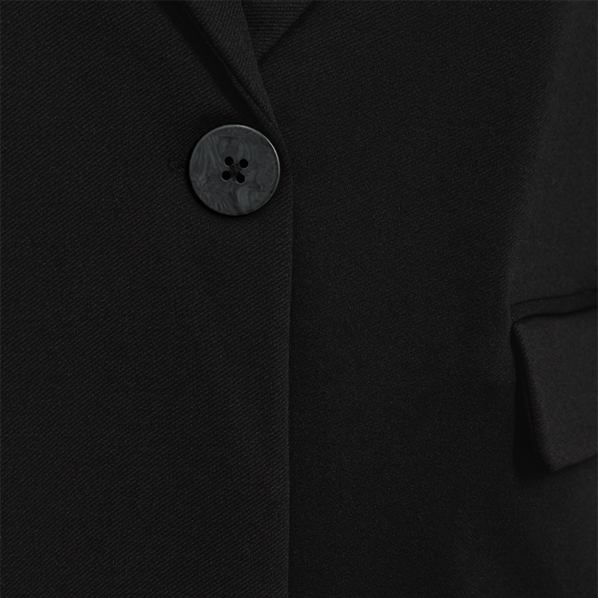 Americana de color negro. Bolsillos con tapeta y cierre con botones.