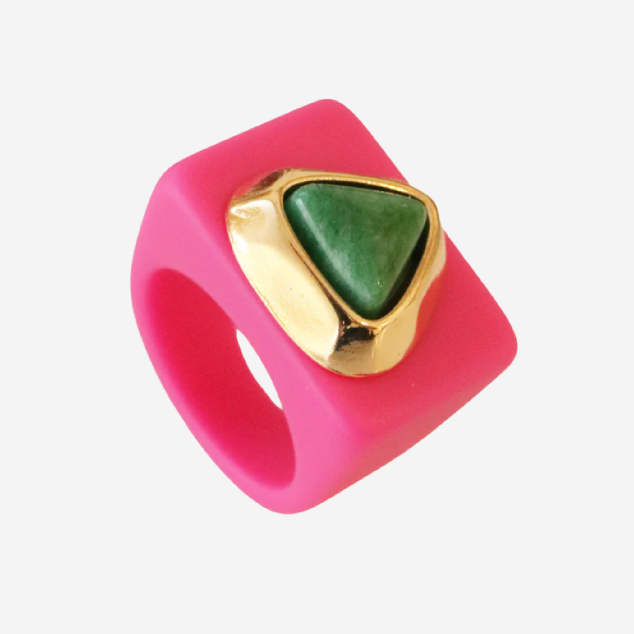 Anillo fucsia con amazonita verde. Hecho a mano en España. Lacado para mayor protección, pieza dorada con baño en oro de 18 kilates y piedra verde natural: