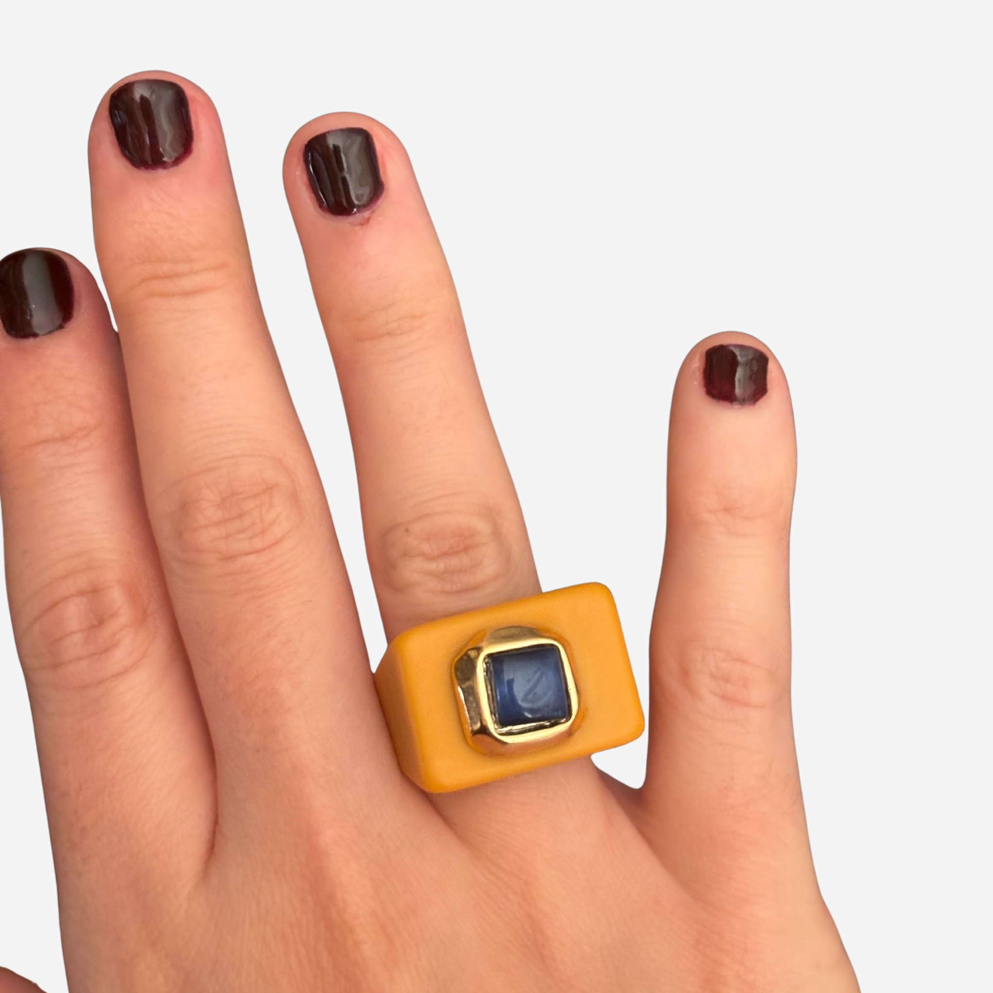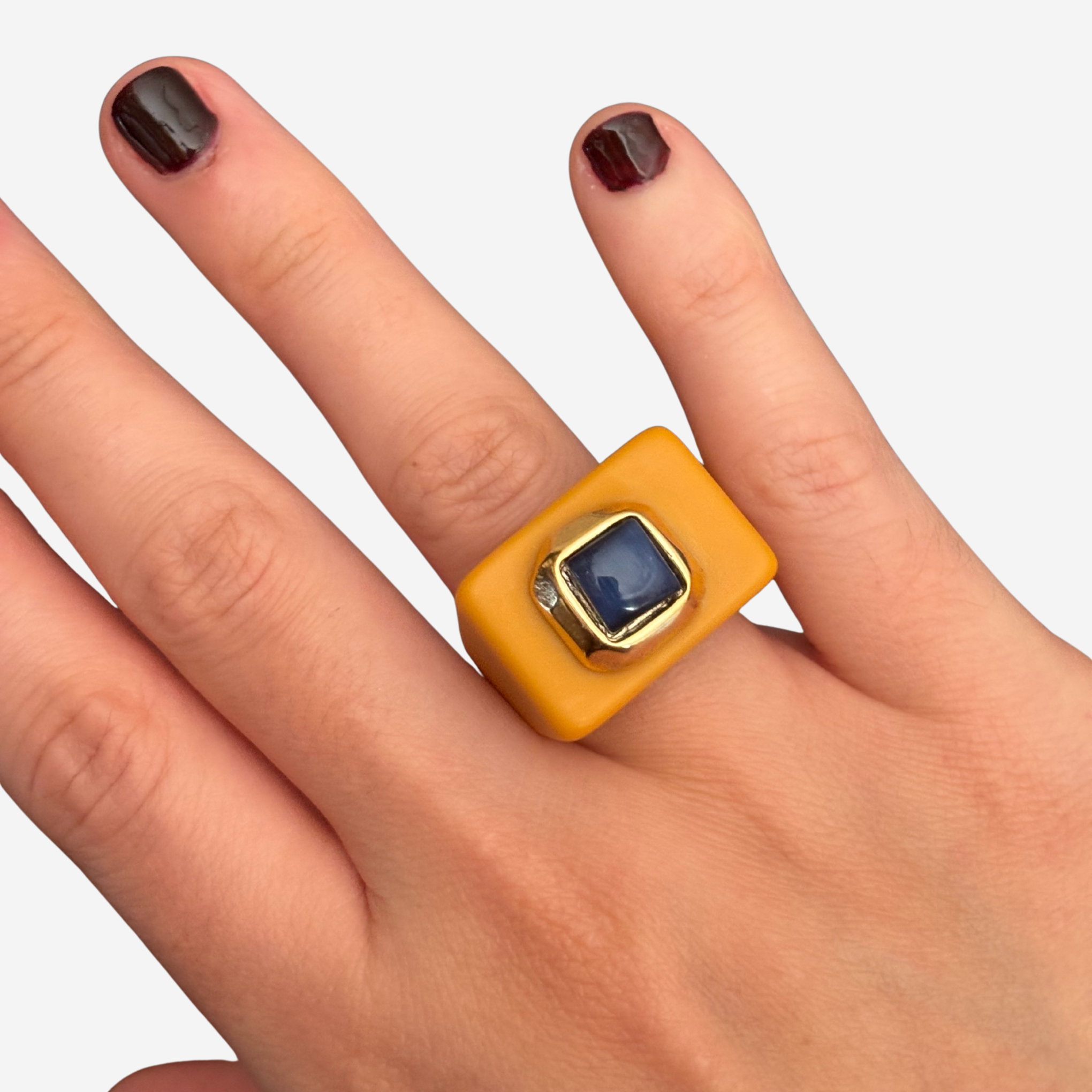 Anillo color mostaza con piedra natural ojo de gato color azul con forma cuadrada: