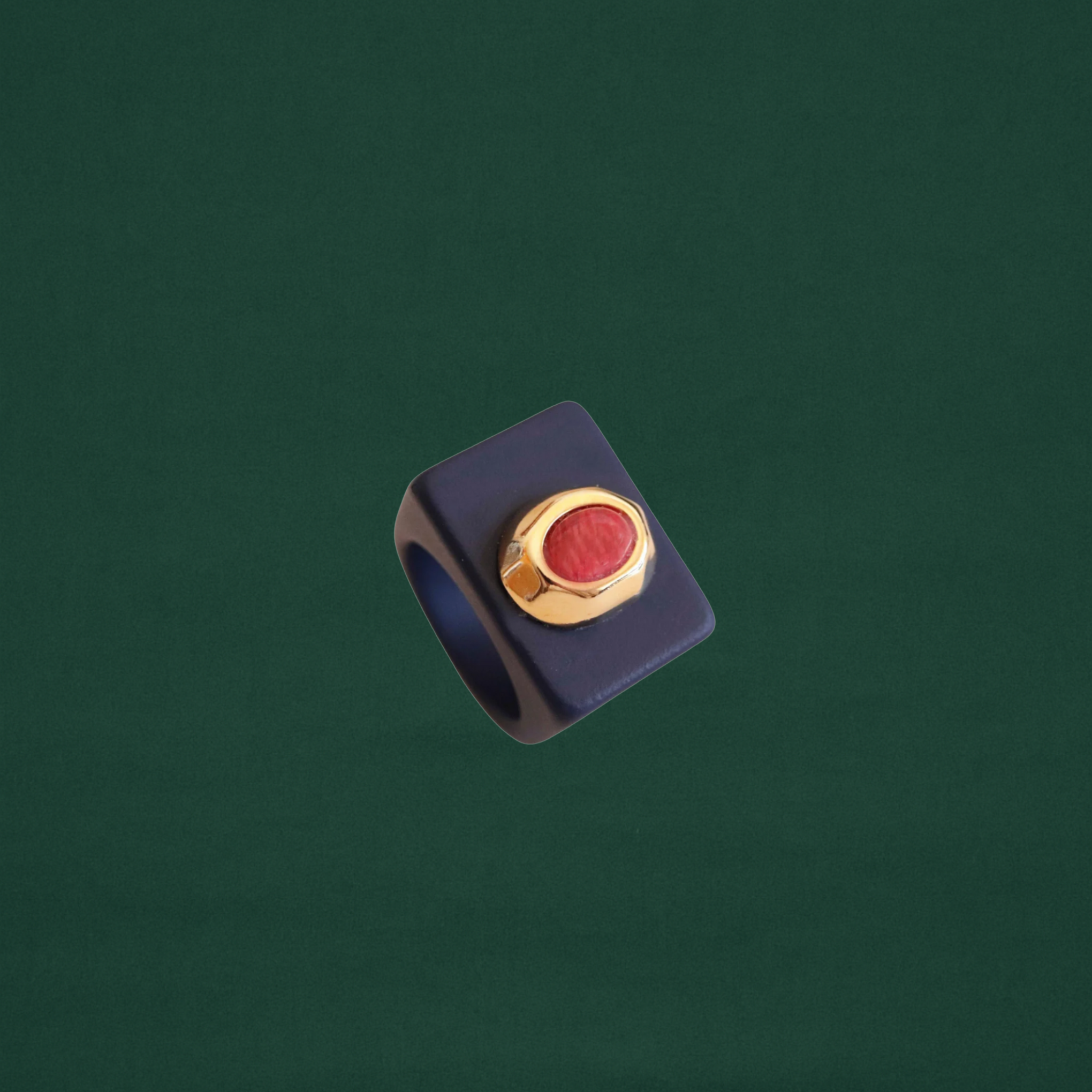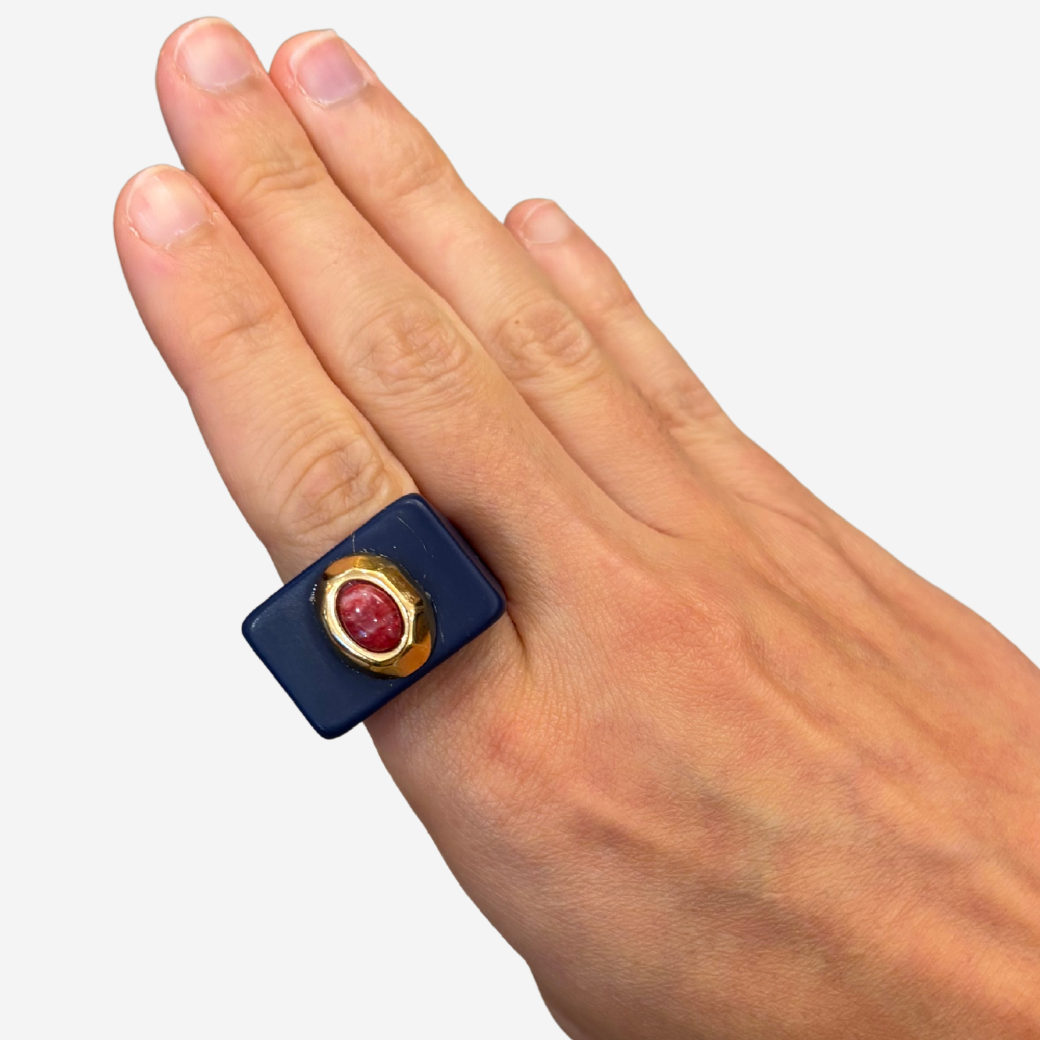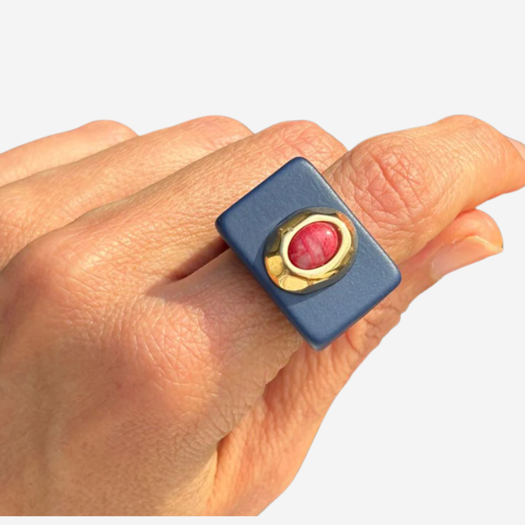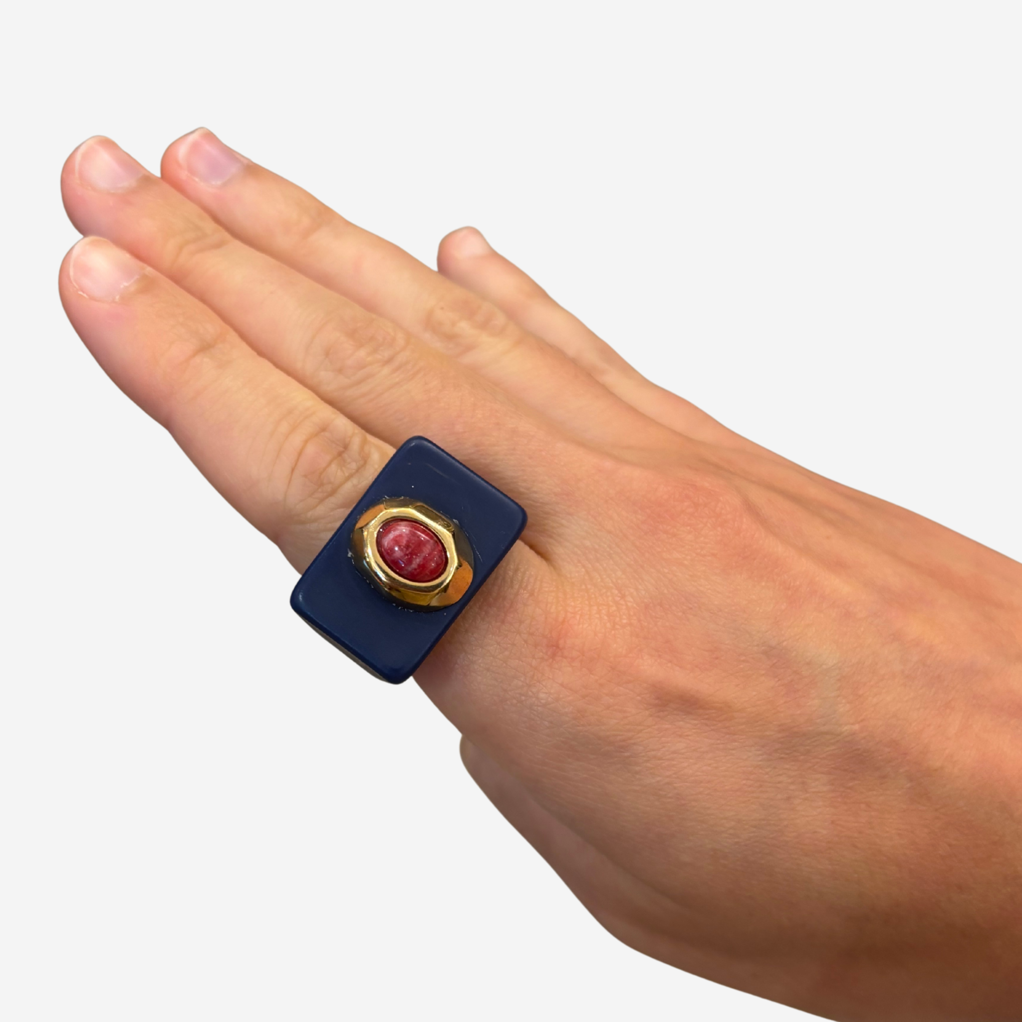 Anillo de color azul marino y piedra natural amazonita color granate y forma ovalada: