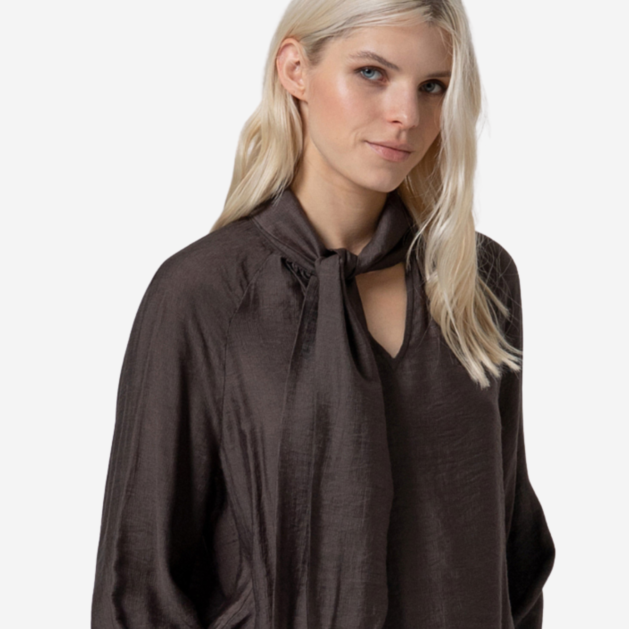 Blusa fluida de viscosa con cuello lazada y puños fruncidos color gris. Caída ligera y elegante que la convierte en una prenda ideal para looks cómodos con un toque refinado.