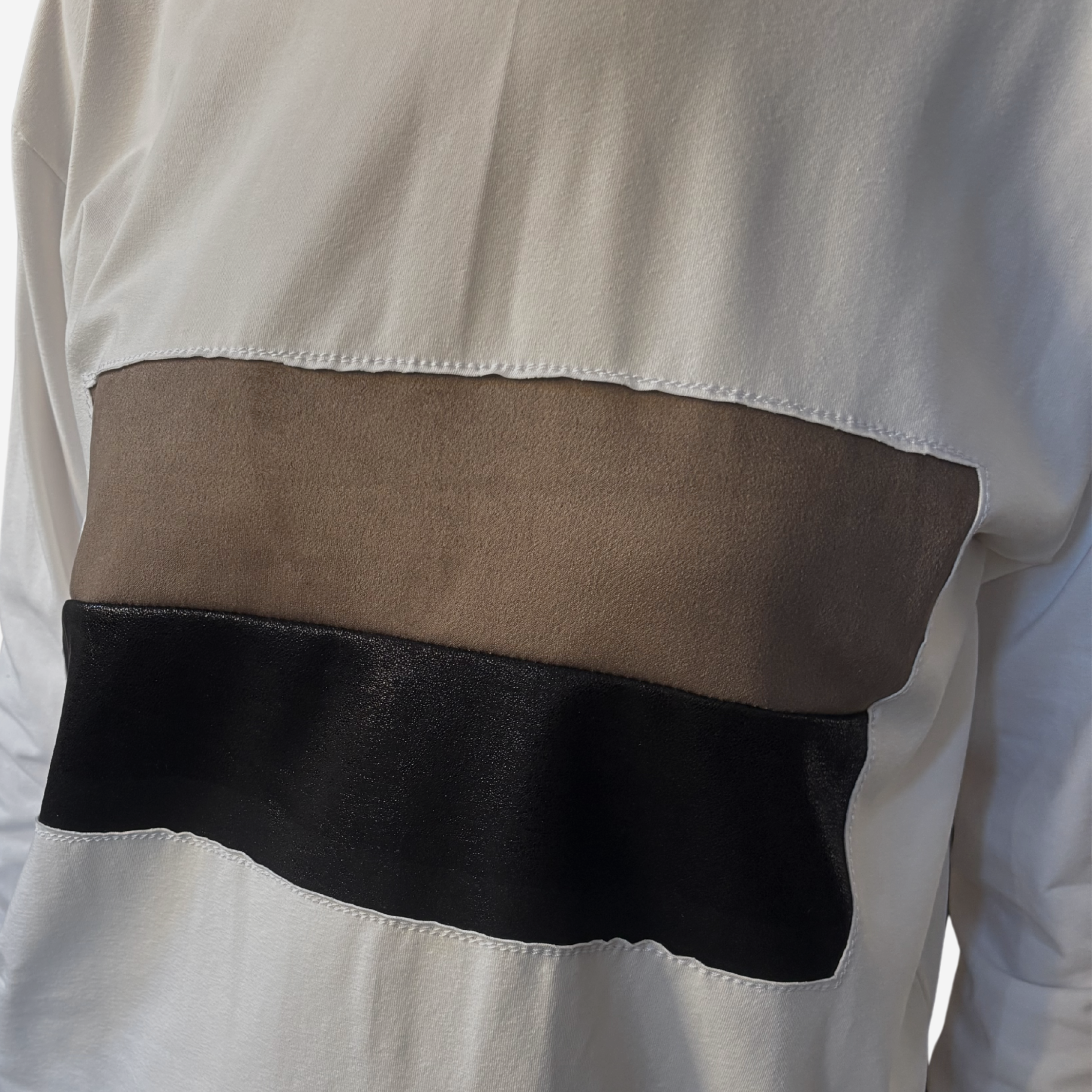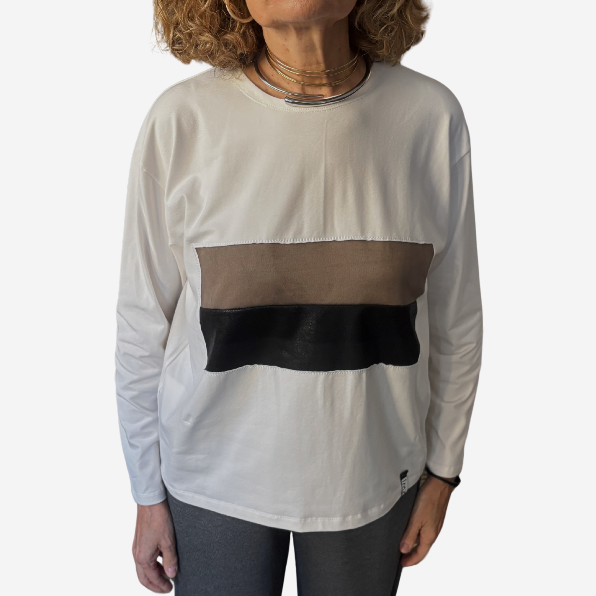 Camiseta color crudo con rectángulo bicolor: la mitad de color marrón y la otra con tejido lurex negro. Manga larga. Es elástica.