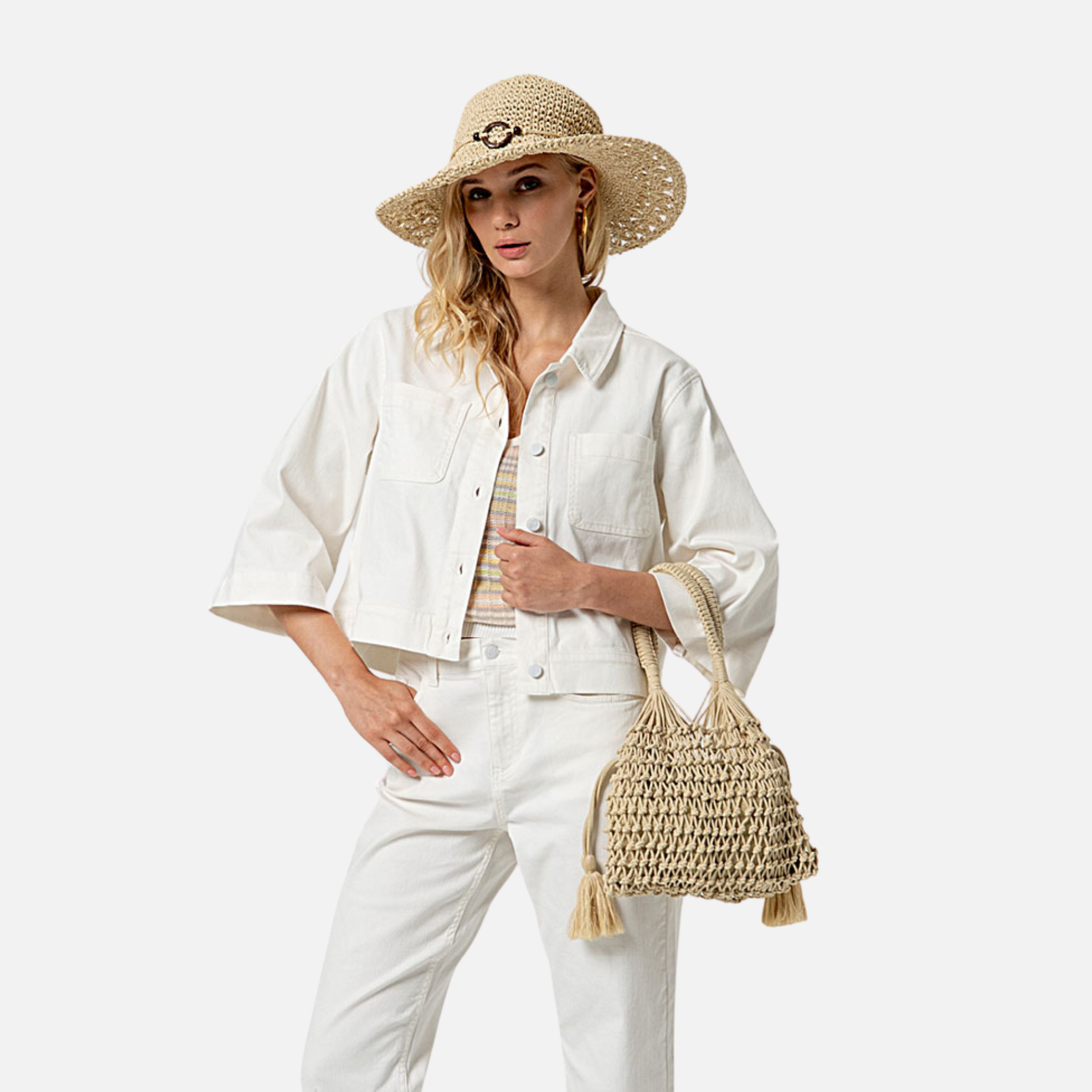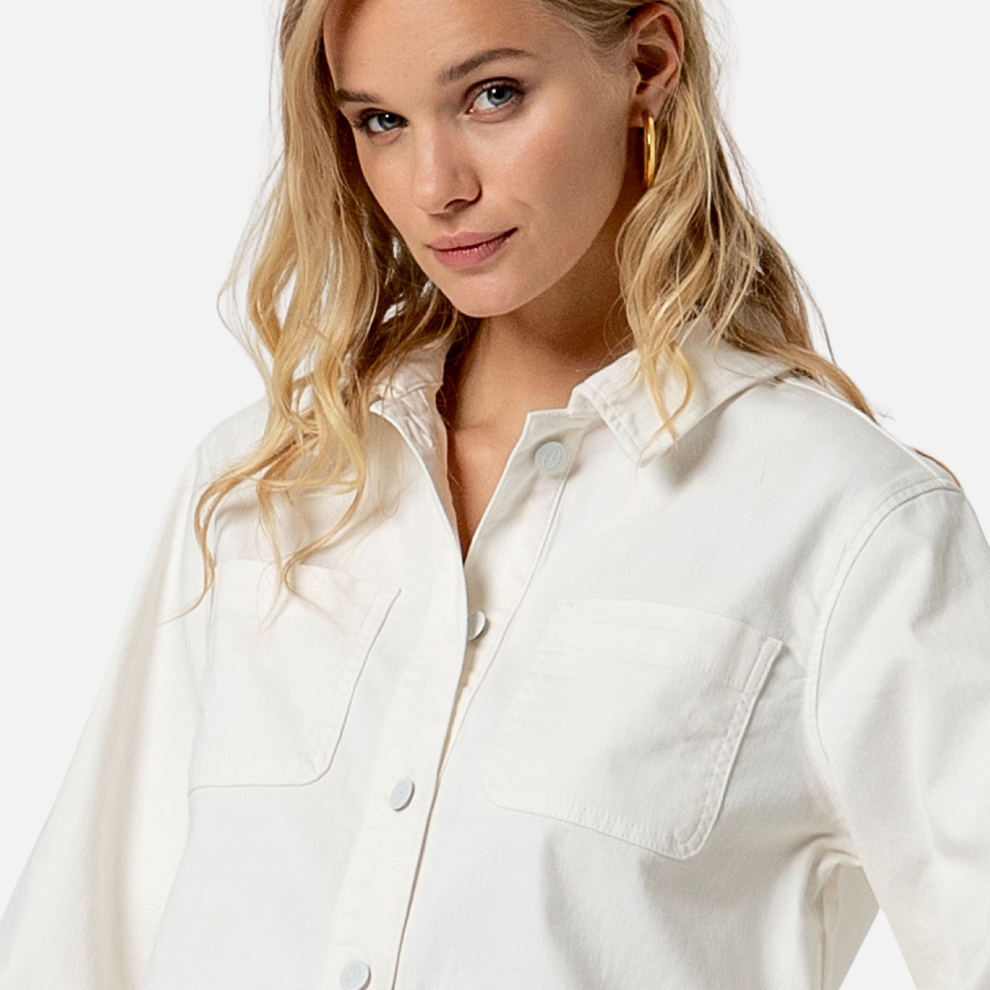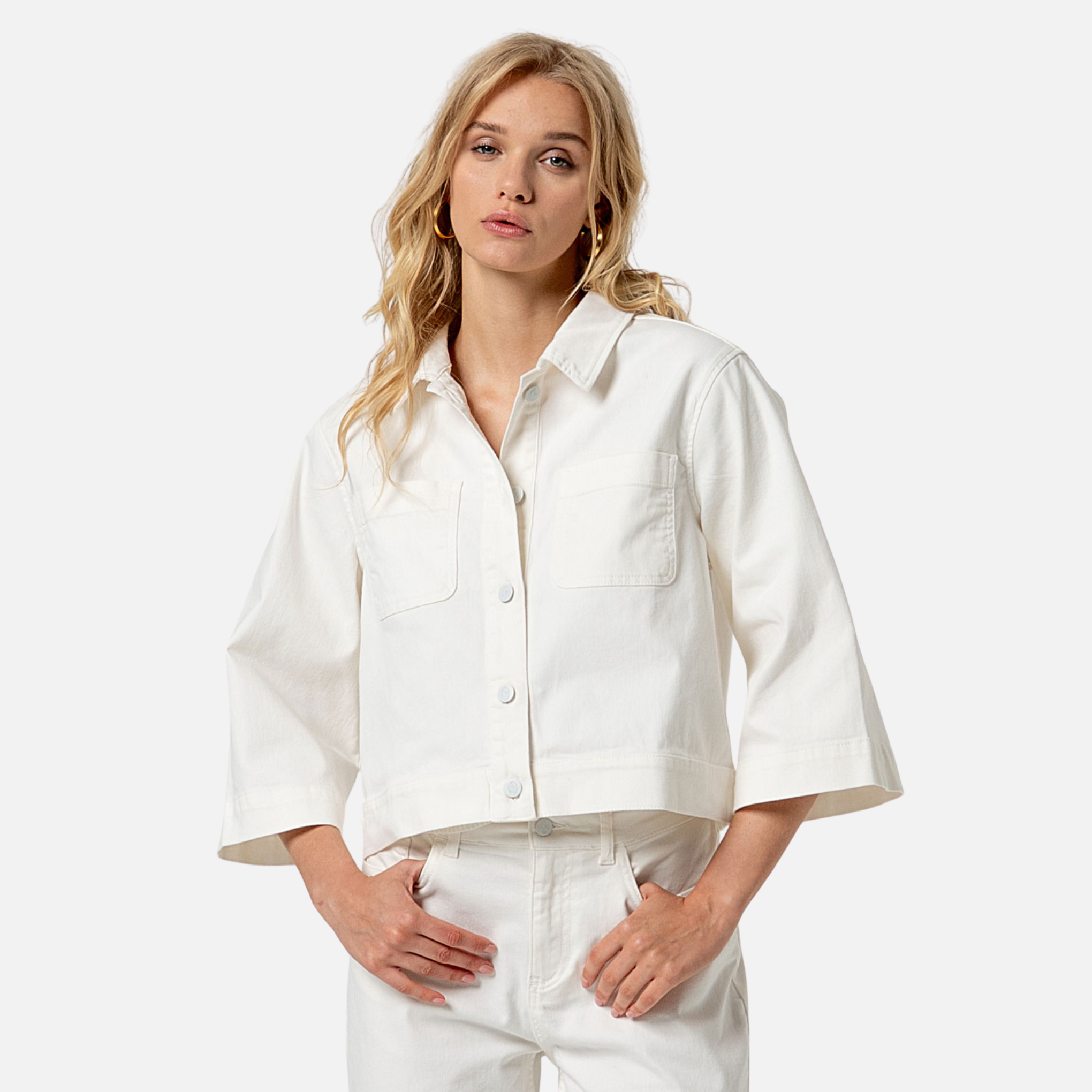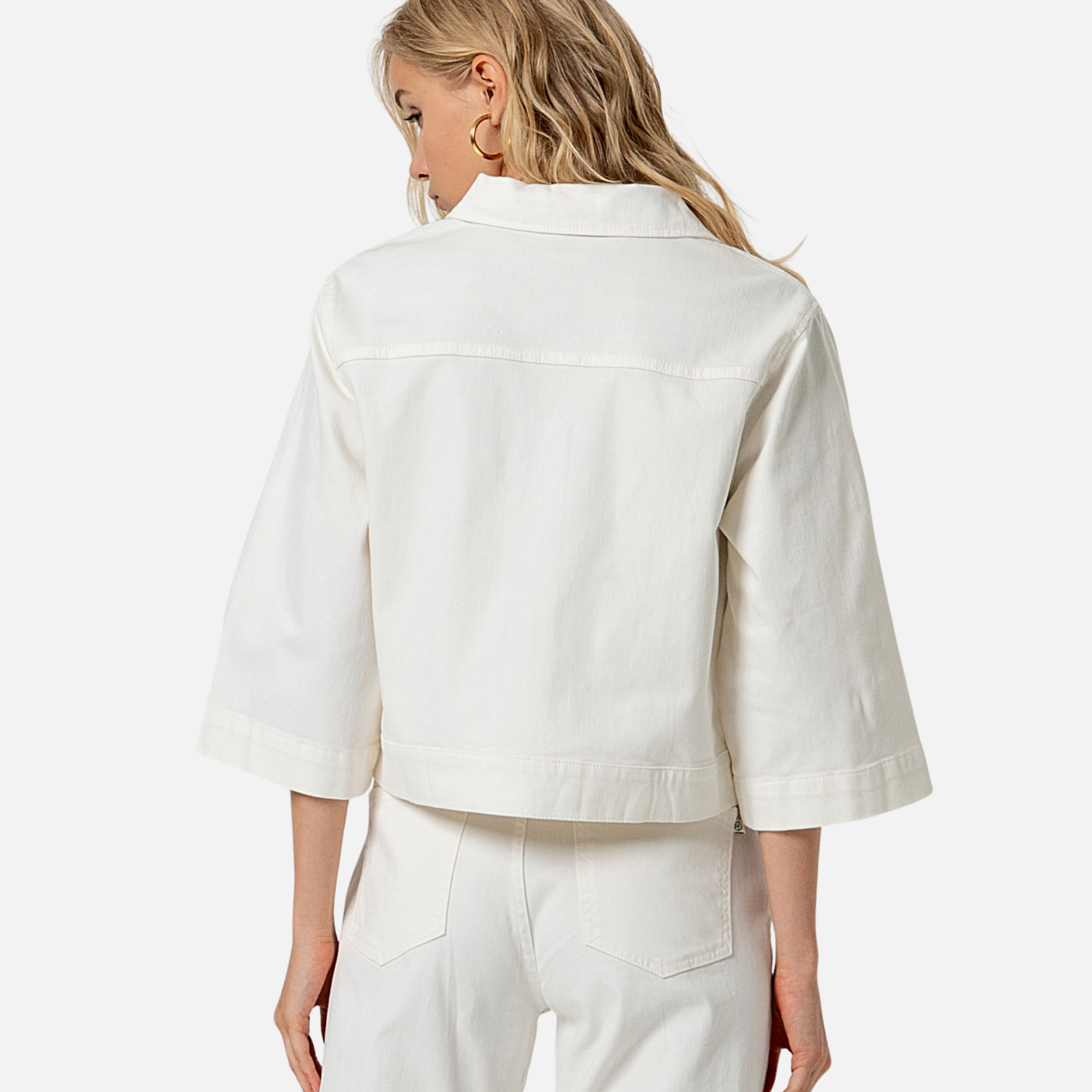 Cazadora vaquera blanca corta con manga francesa (3/4). Se cierra con botones y tiene bolsillos de plastón.