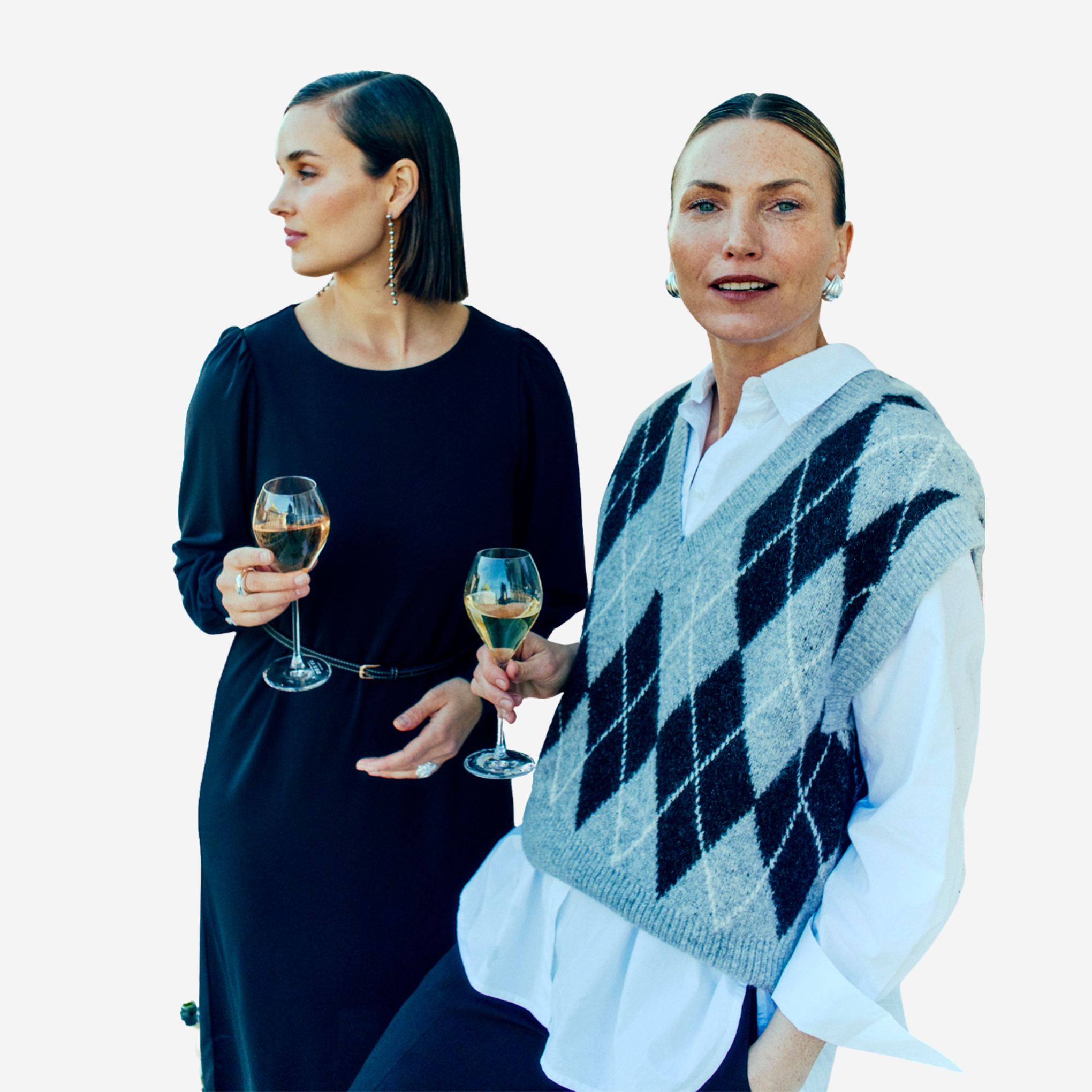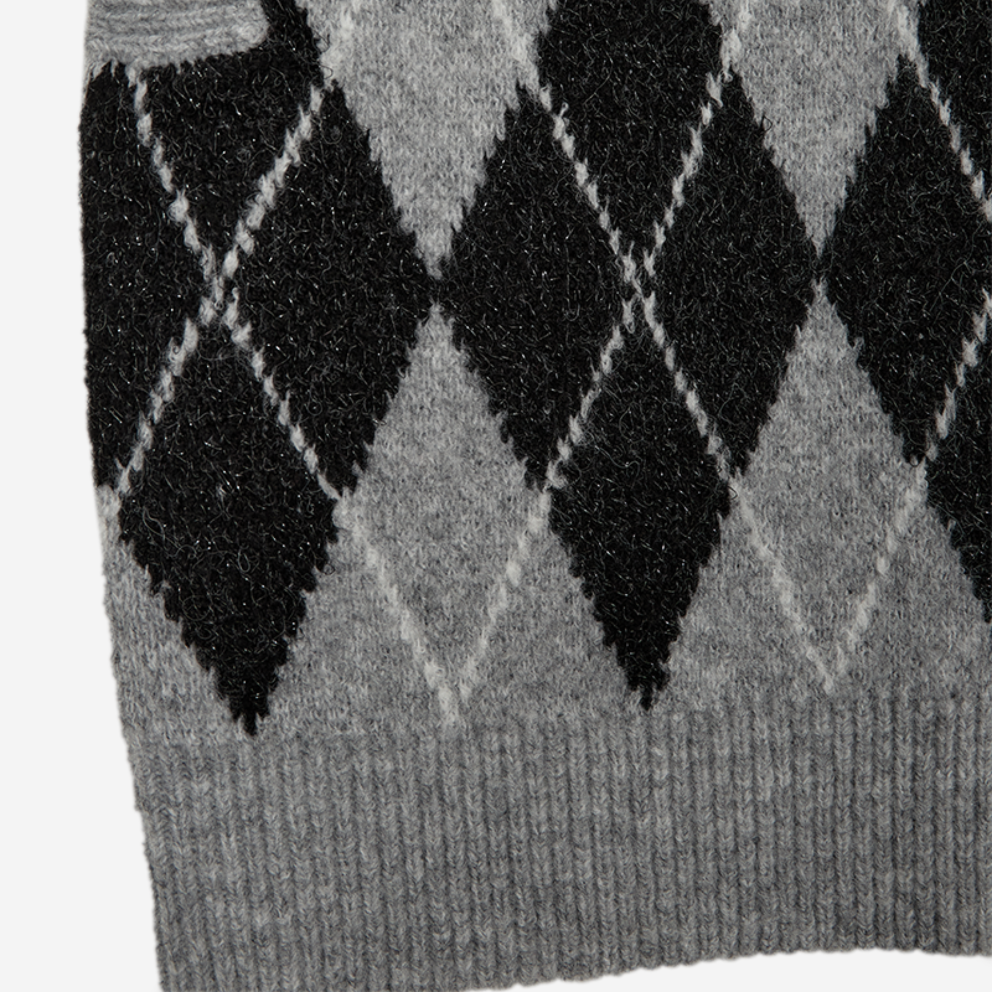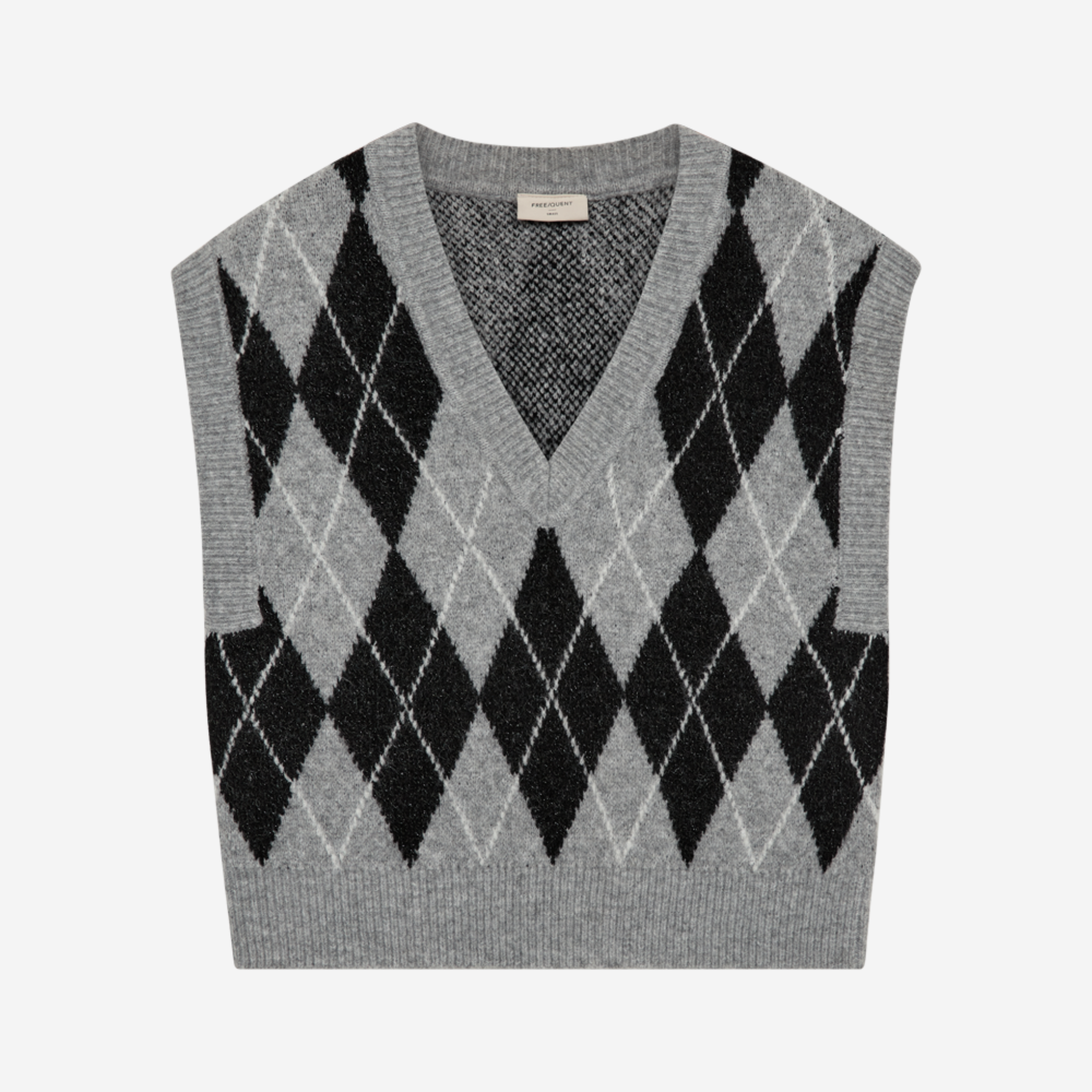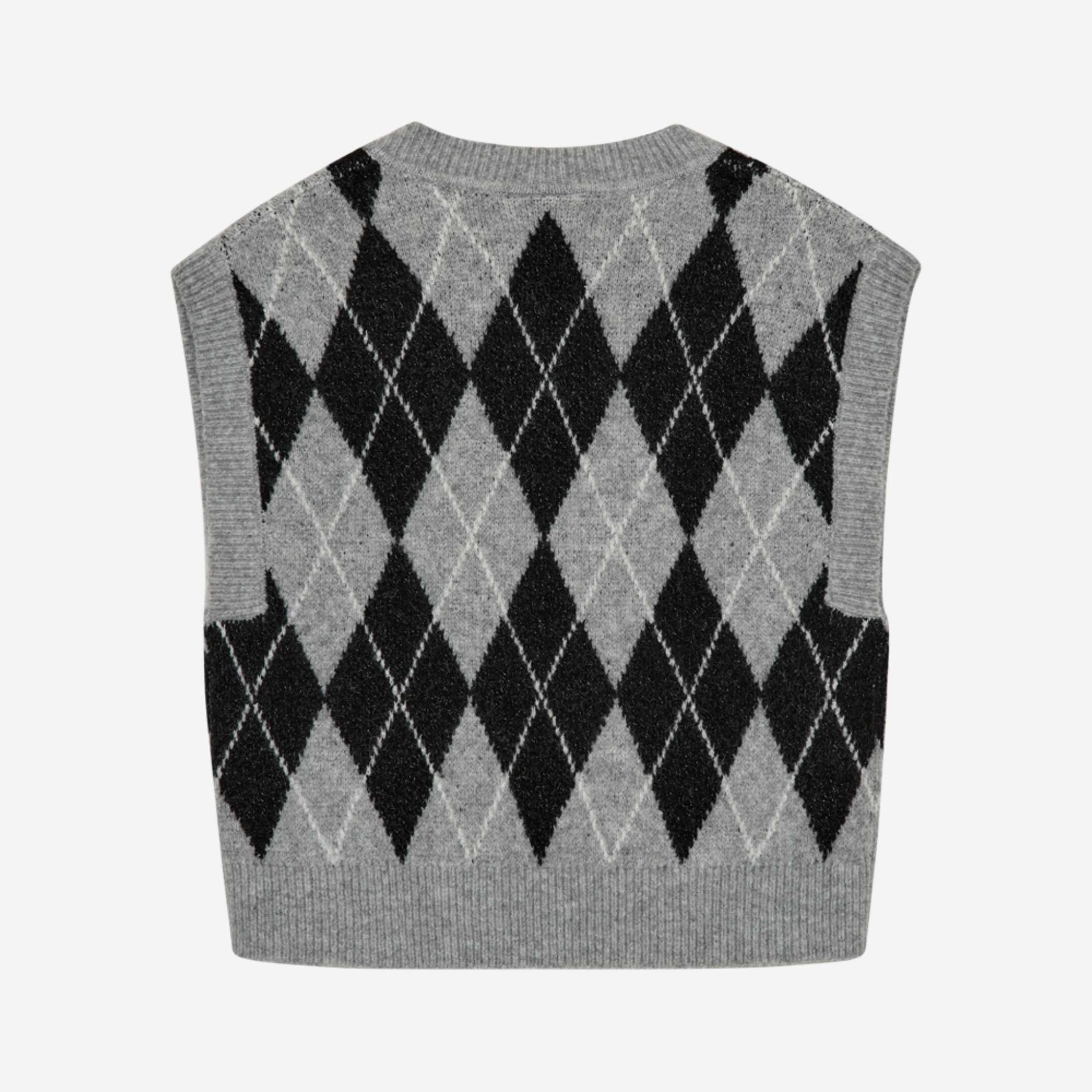 Chaleco/ Jersey sin mangas de color gris y rombos negros con hilo de metal. Un clásico renovado.