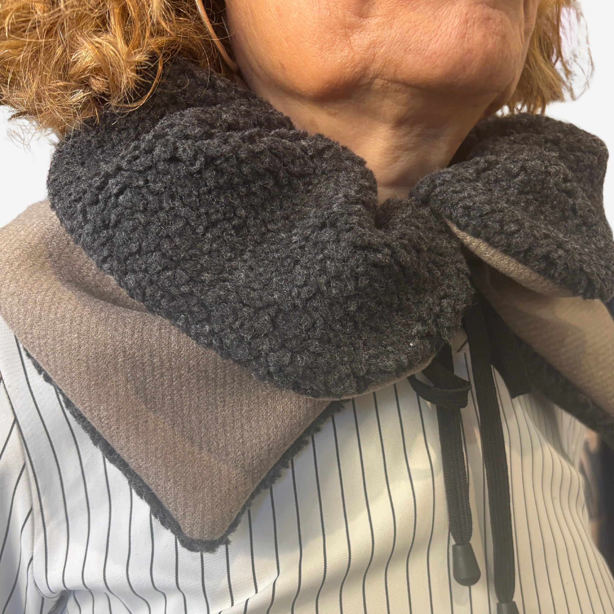 Cuello colo marrón y pelo por el otro lado color gris. Cierre con cordón
