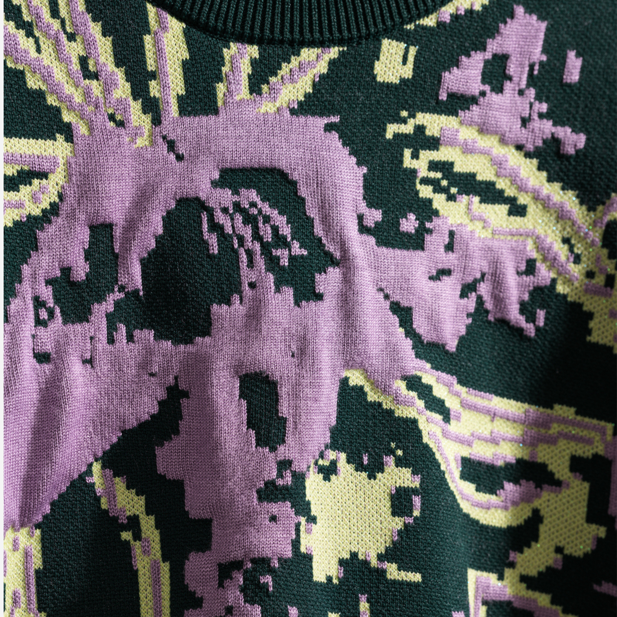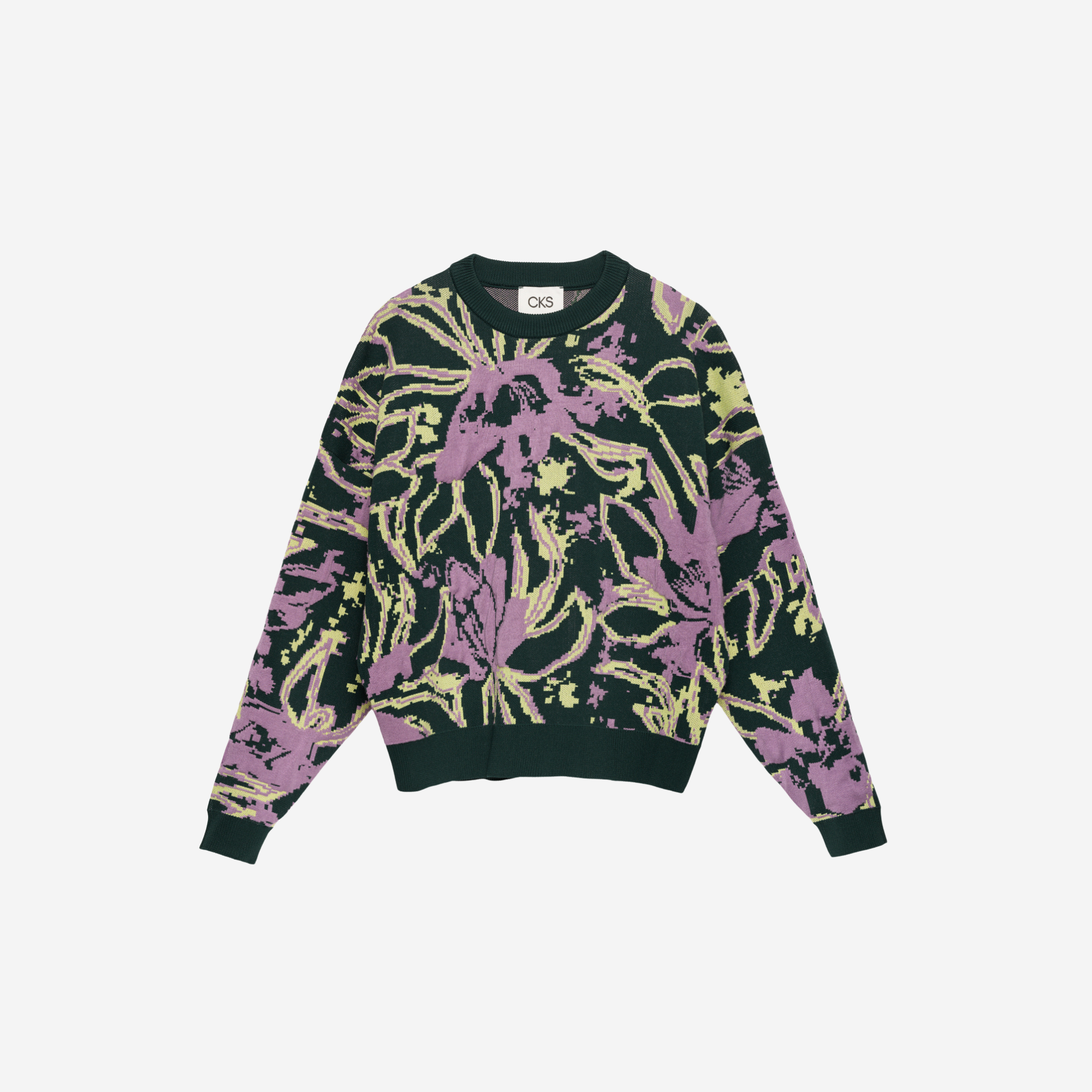 Jersey color verde oscuro con flores en tonos rosa y amarillo. Cuello redondo y goma en el puño.