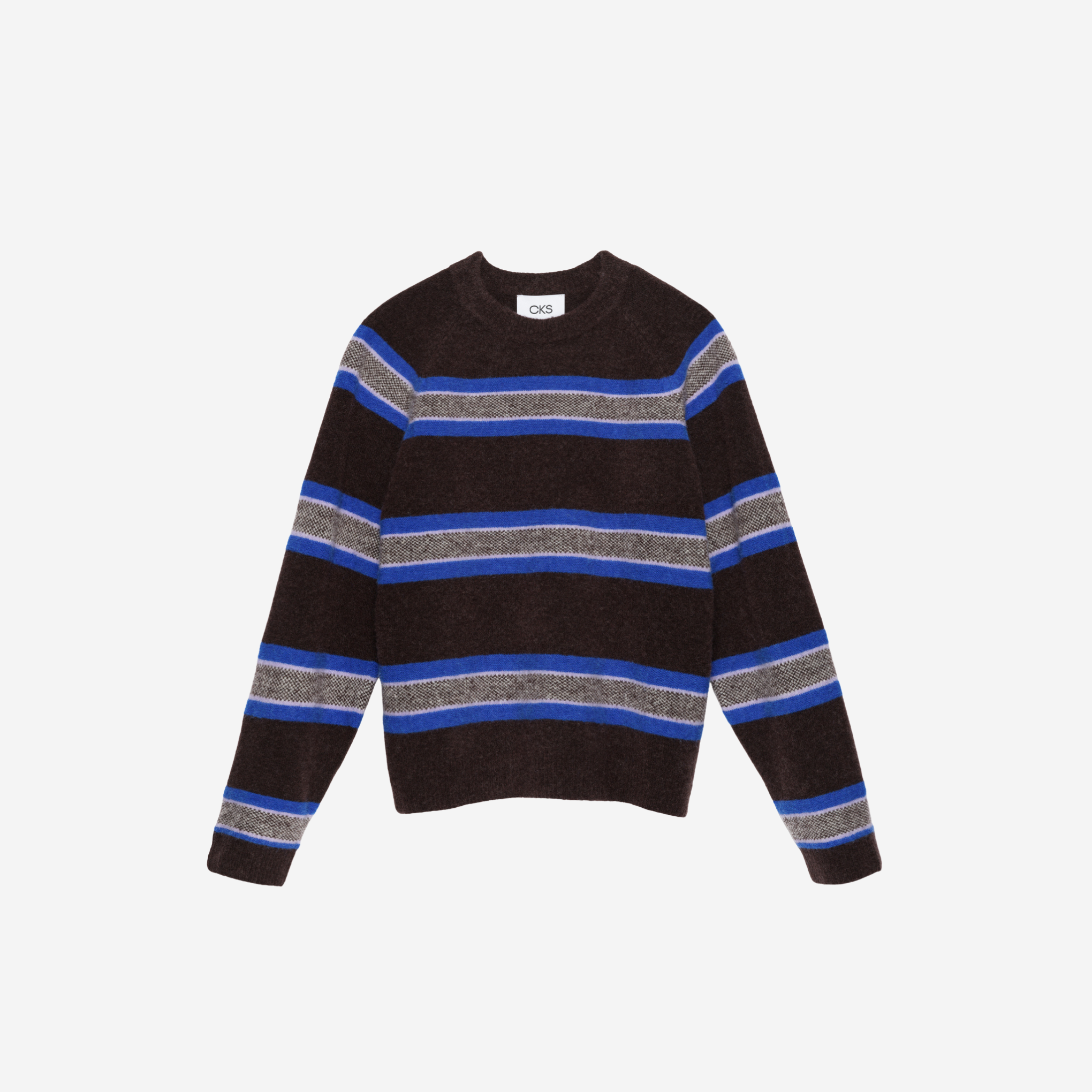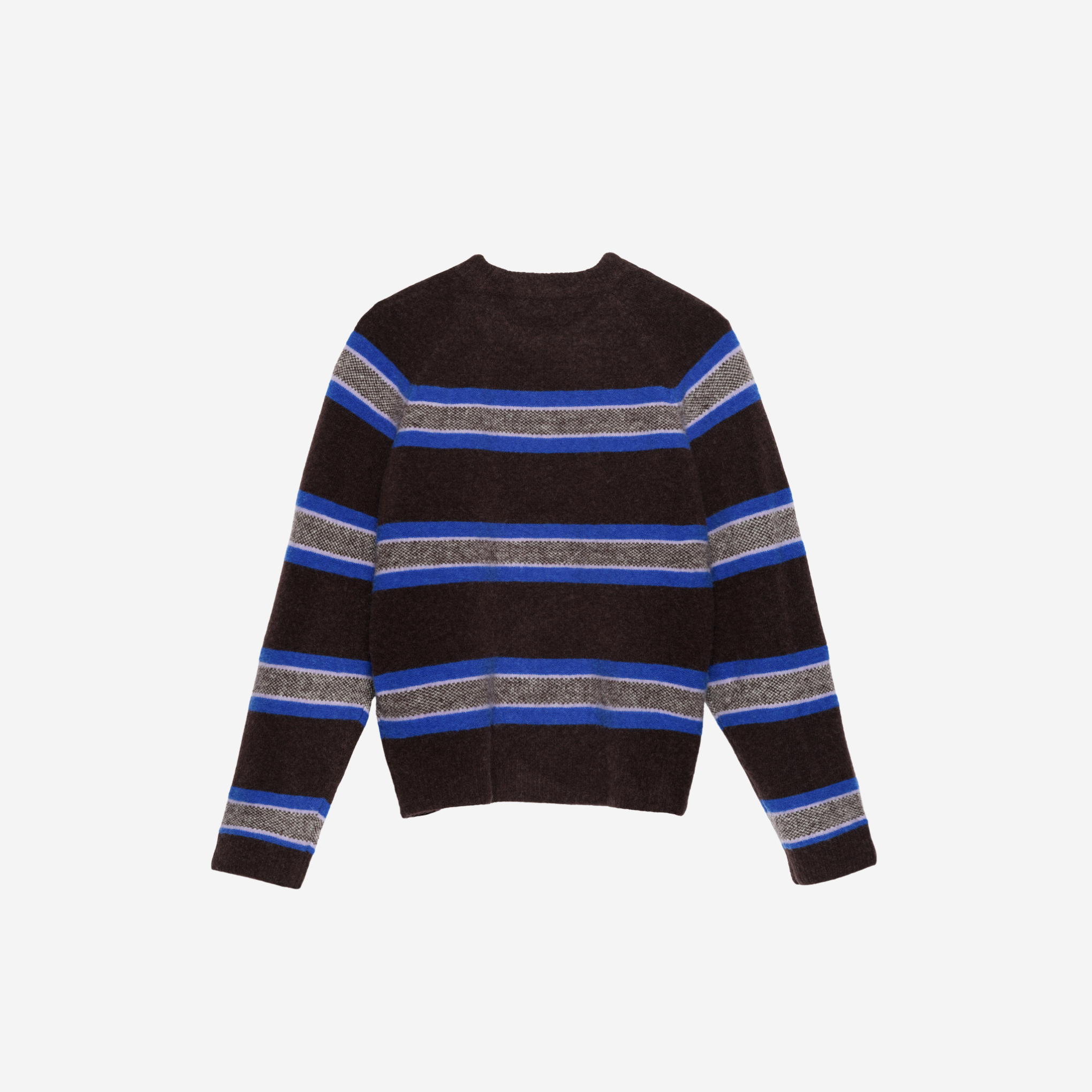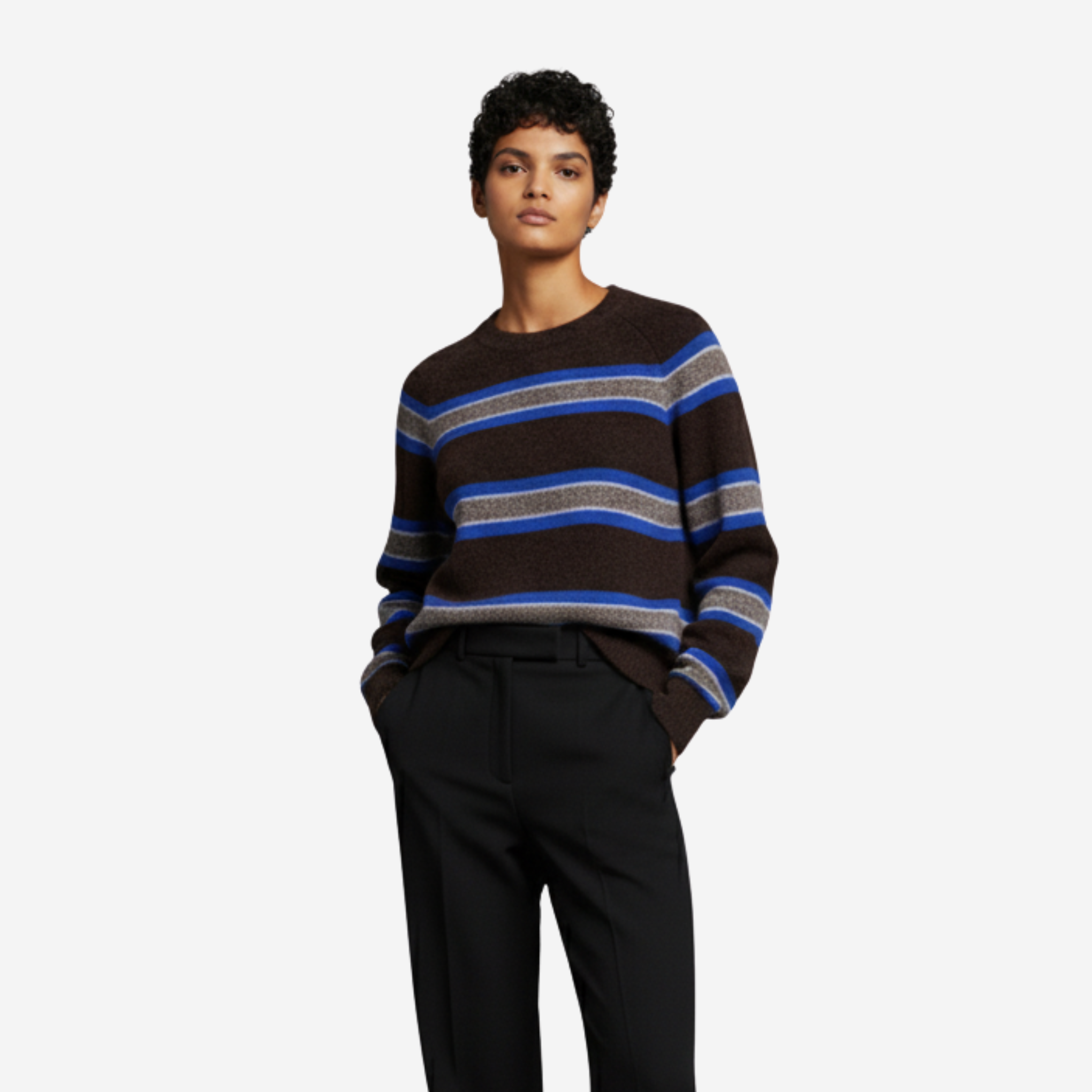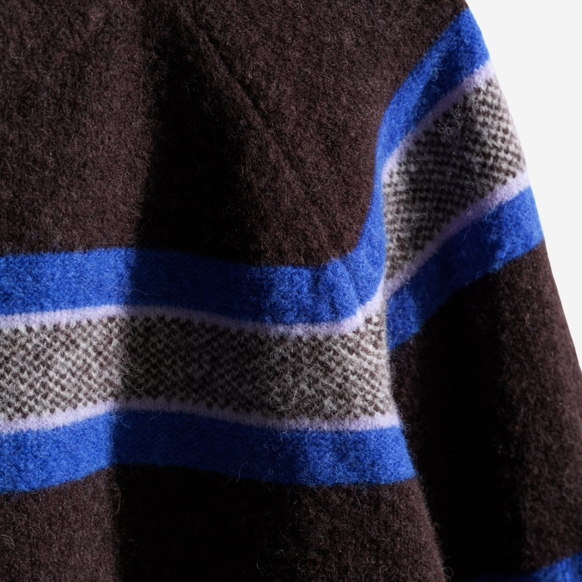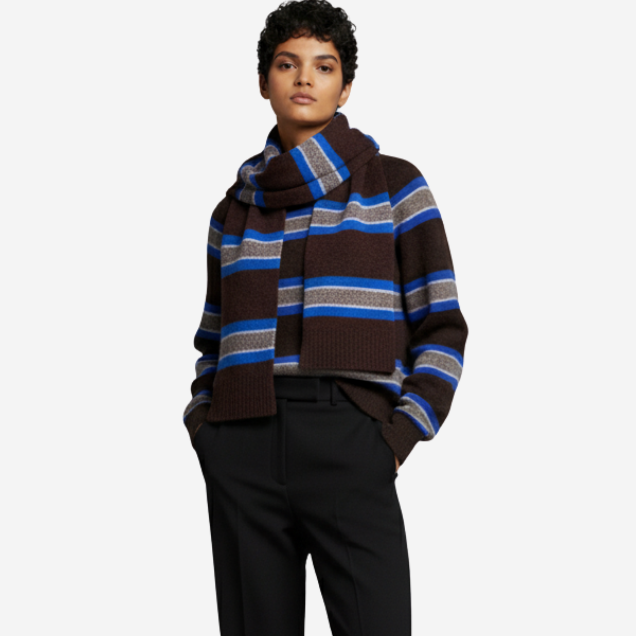 Jersey de color marrón oscuro y rayas color azul. ¡Hace conjunto con la bufanda del mismoe stampado!
