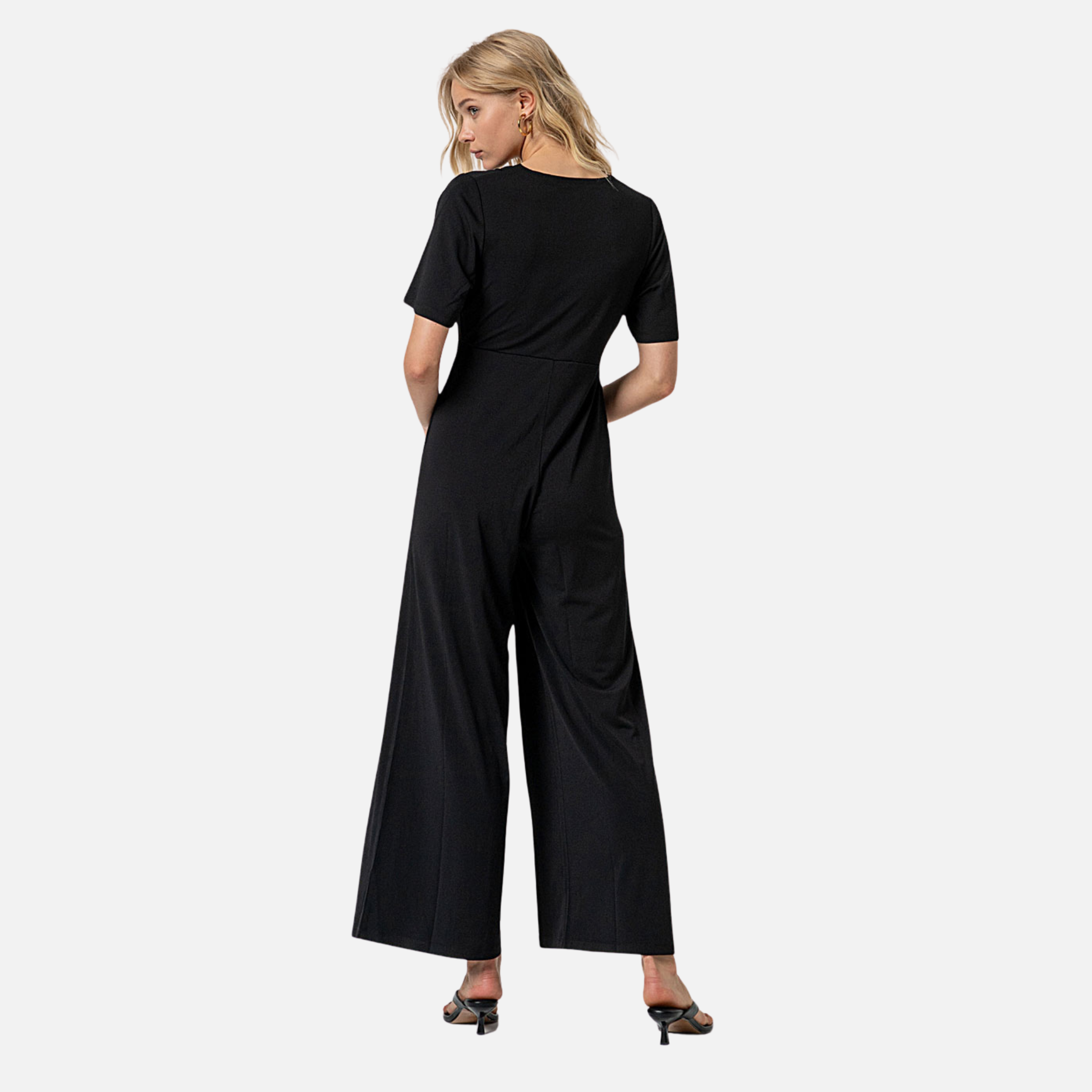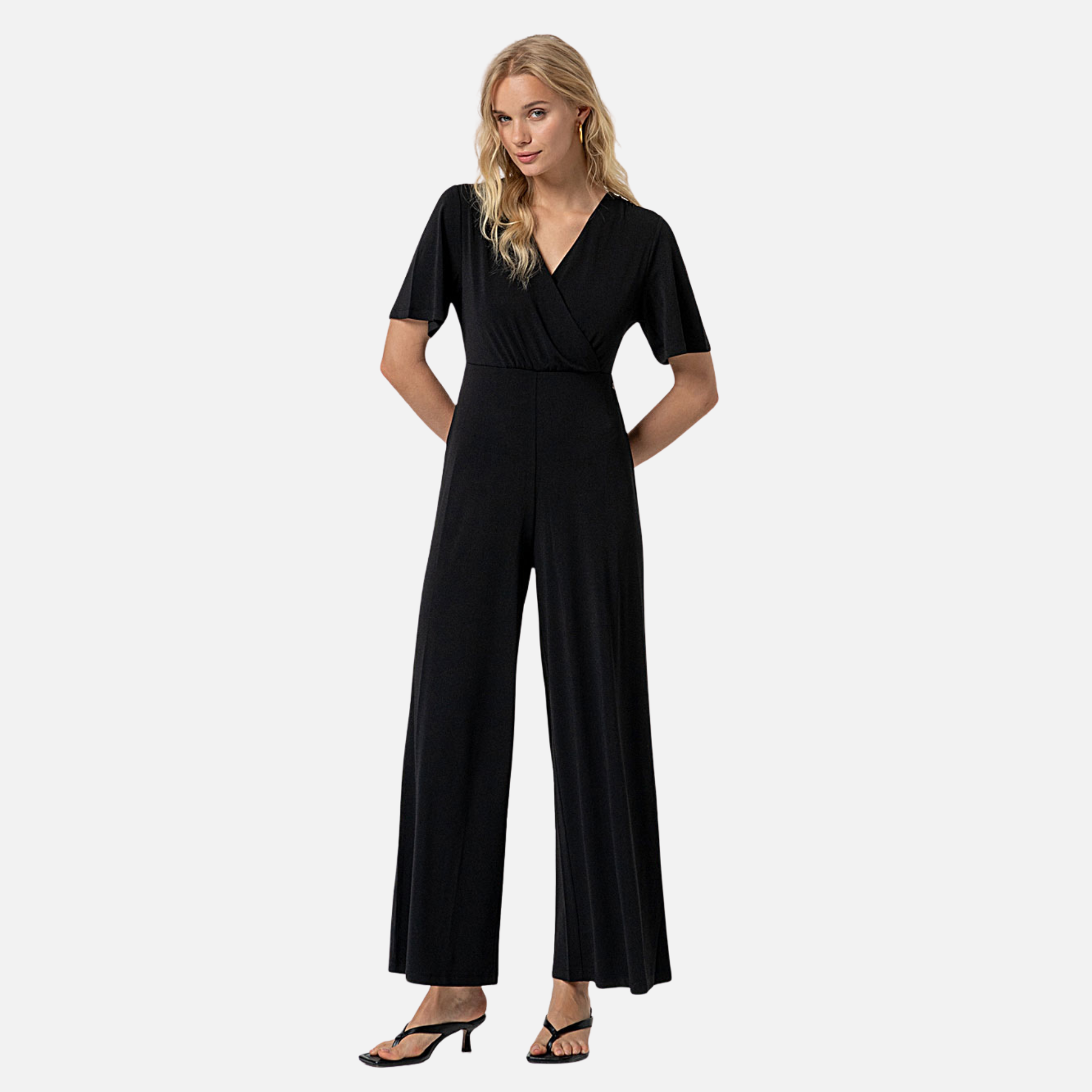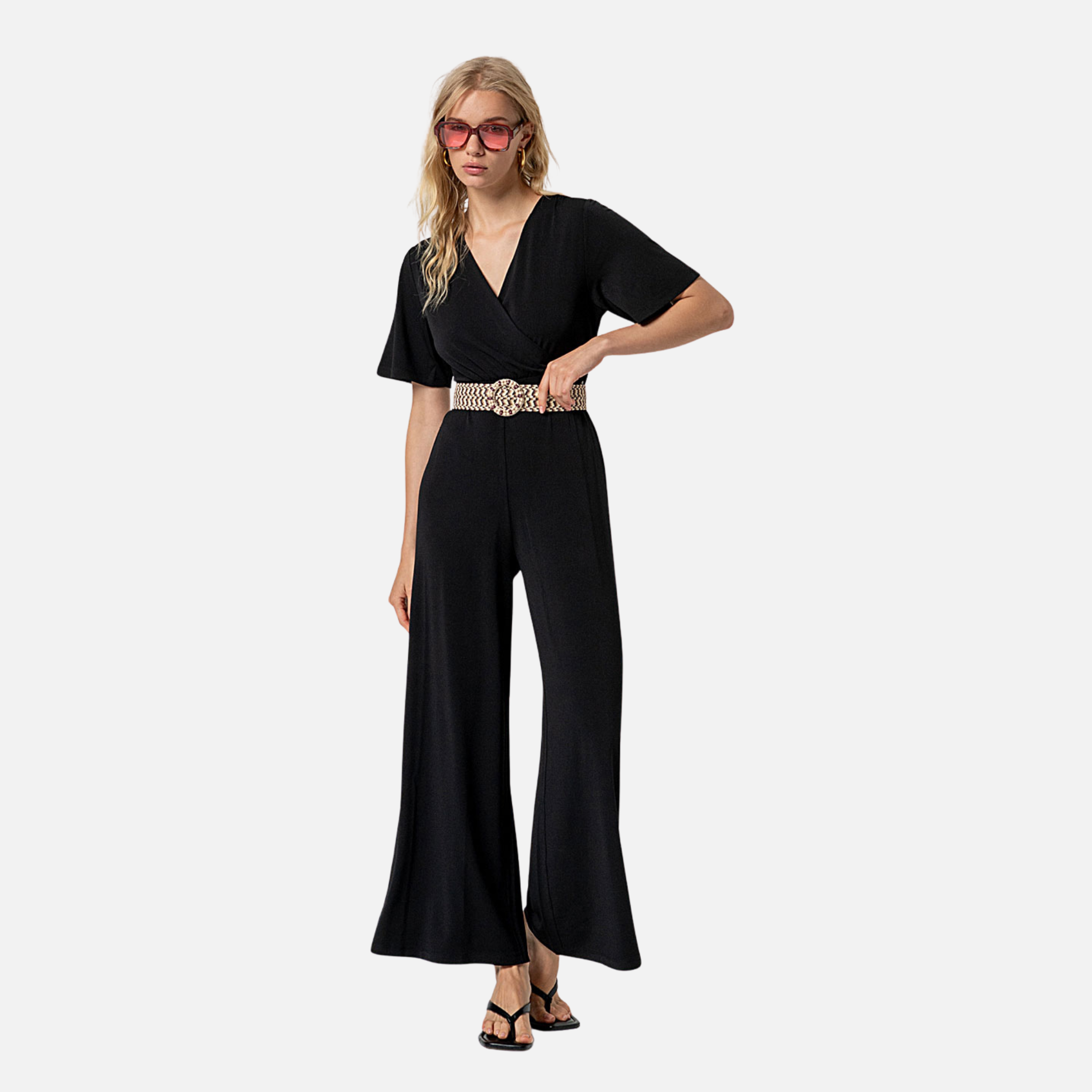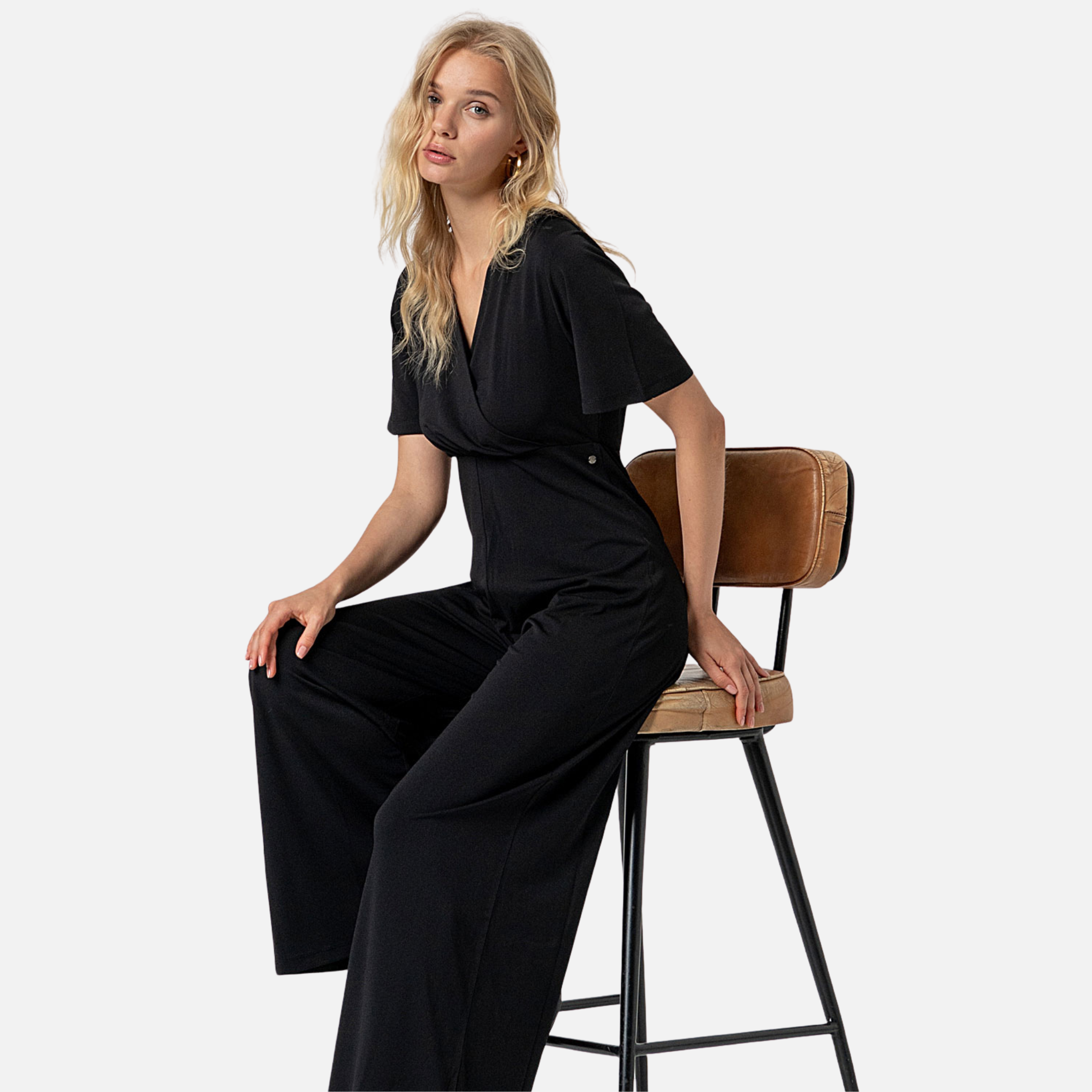 Mono de color negro con escote cruzado. El pantalón del mono es recto y tobillero.