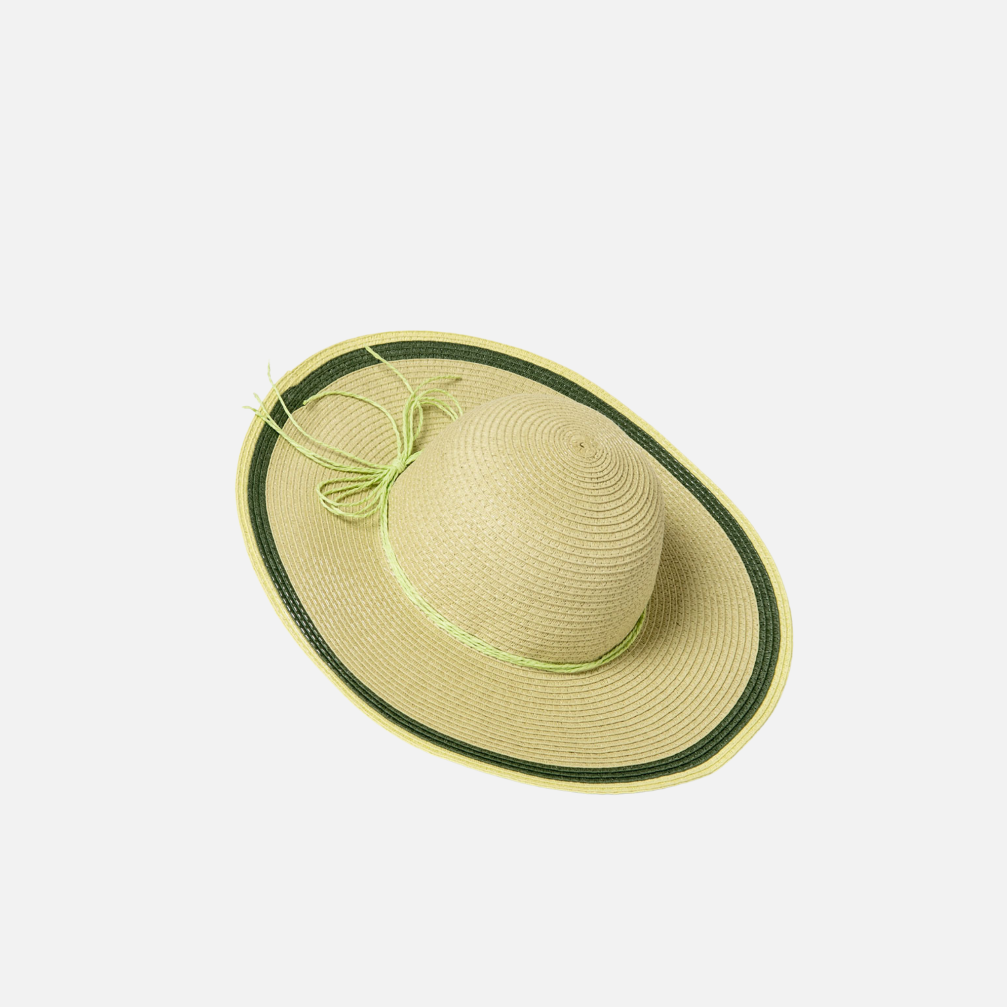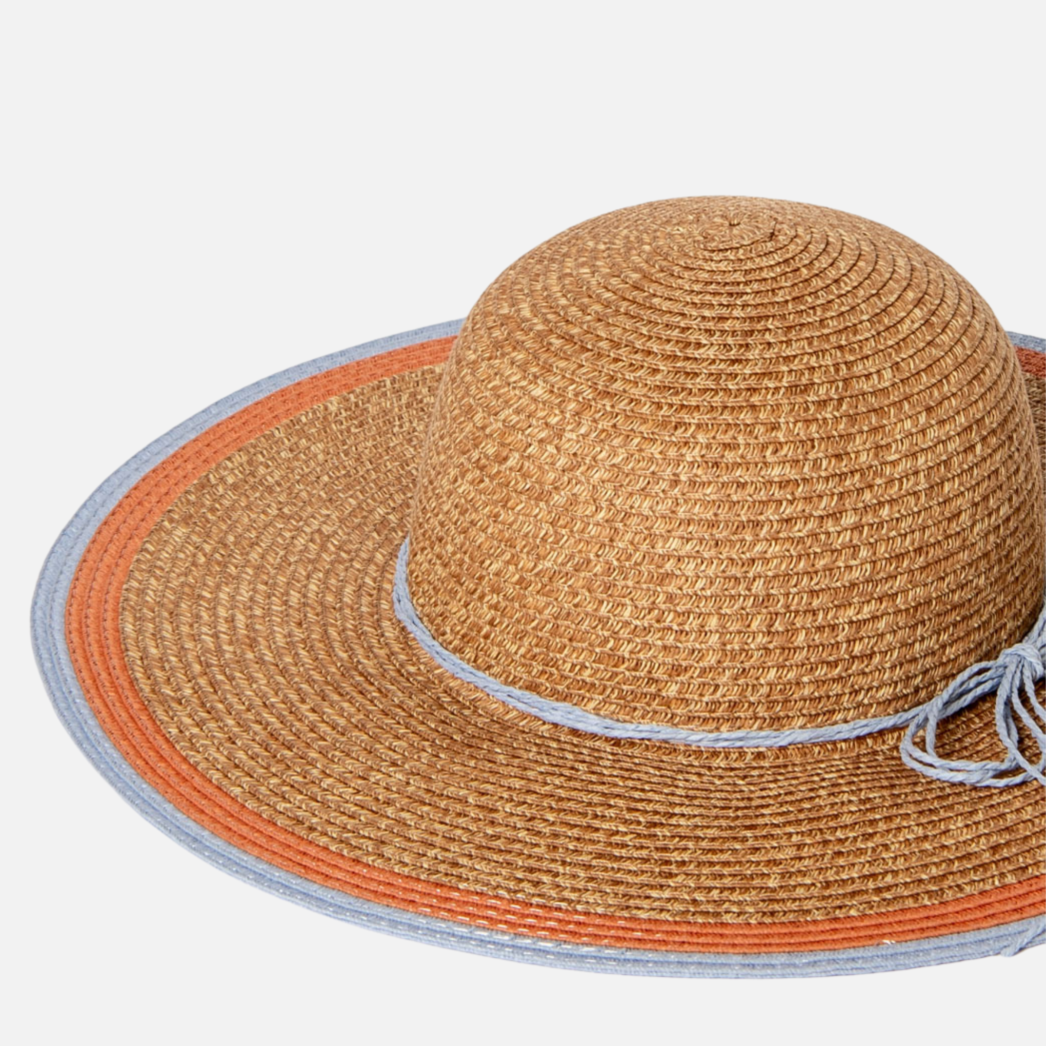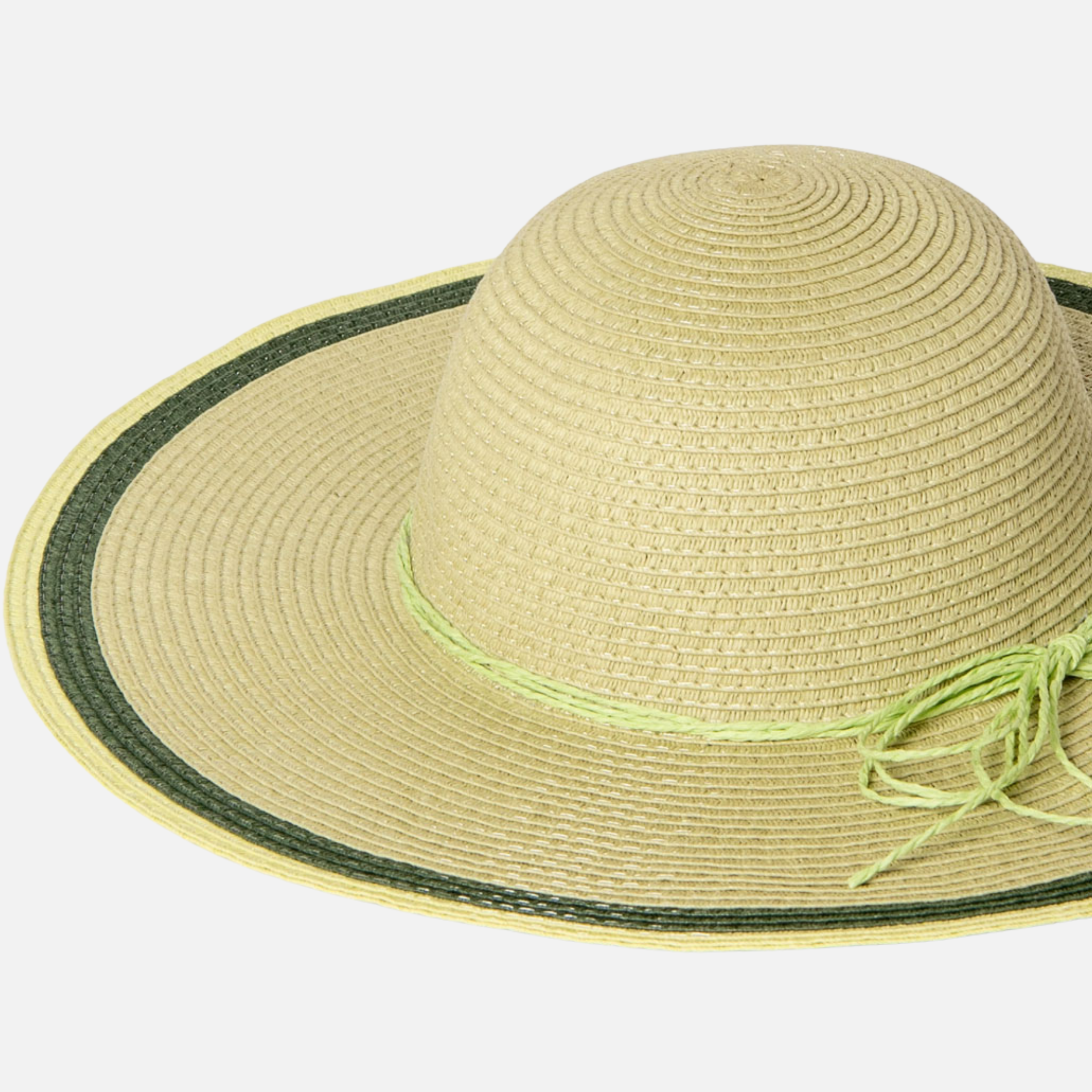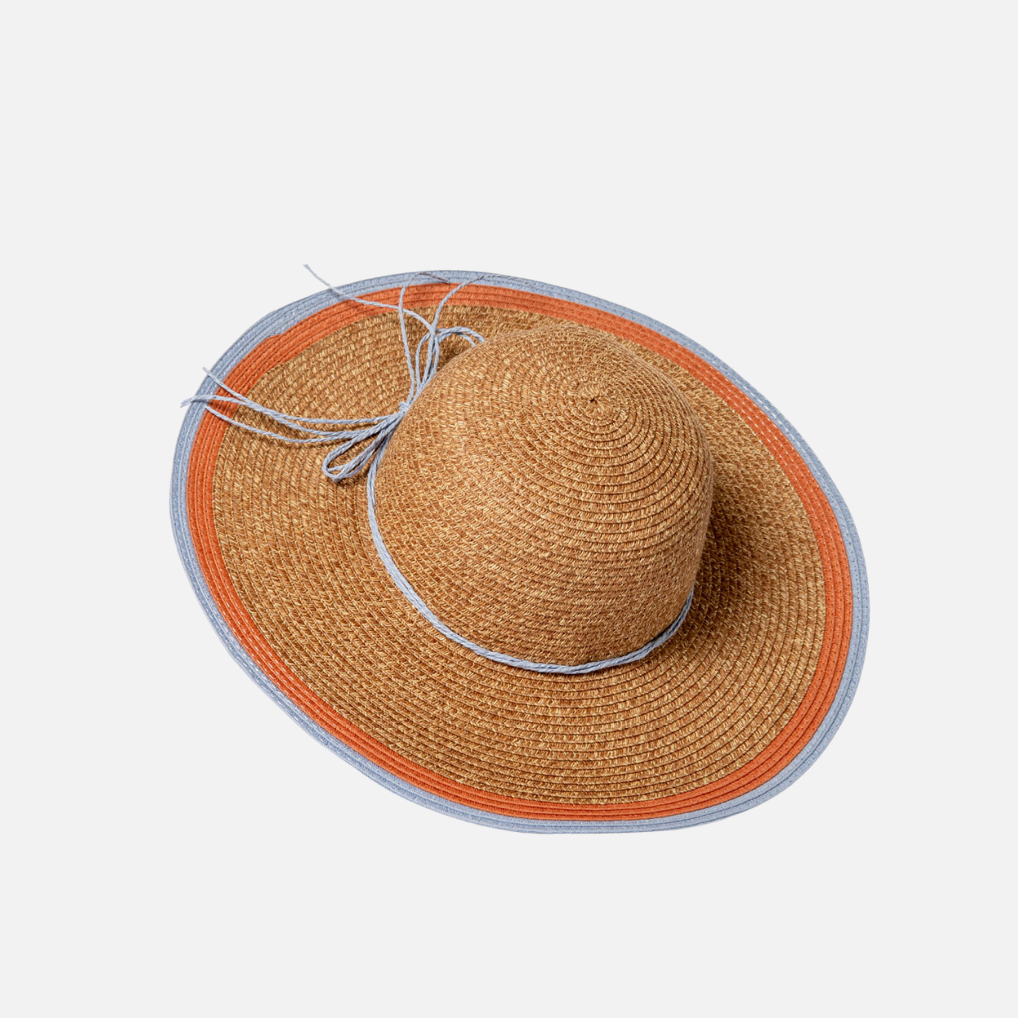 Pamela de ala ancha con copa redondeada y estructura ligera, tejida en papel tipo rafia. La trama es regular y flexible, lo que permite que se adapte sin perder forma. El detalle a contraste en el contorno del ala y el cordón aportan un punto de diseño sin recargar.