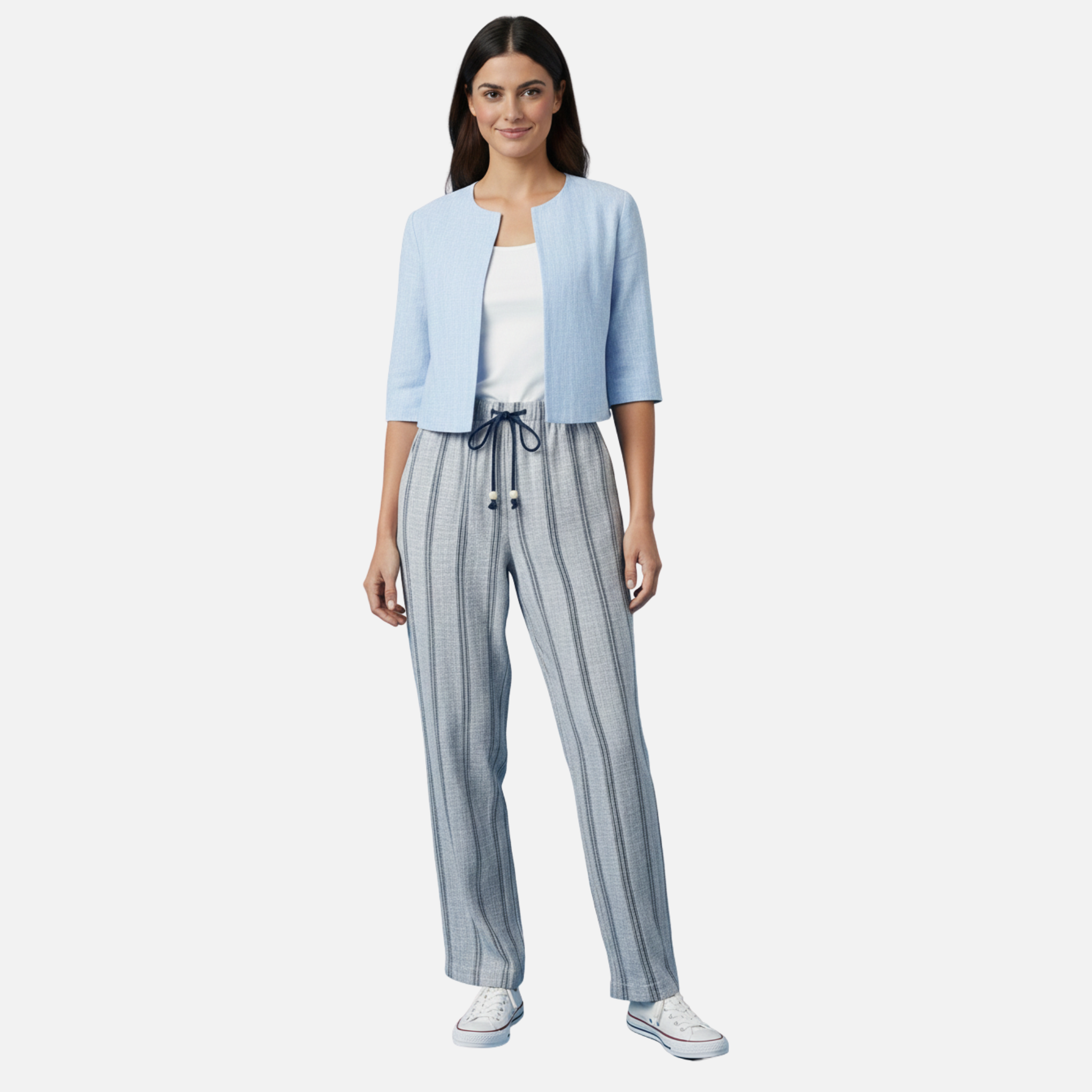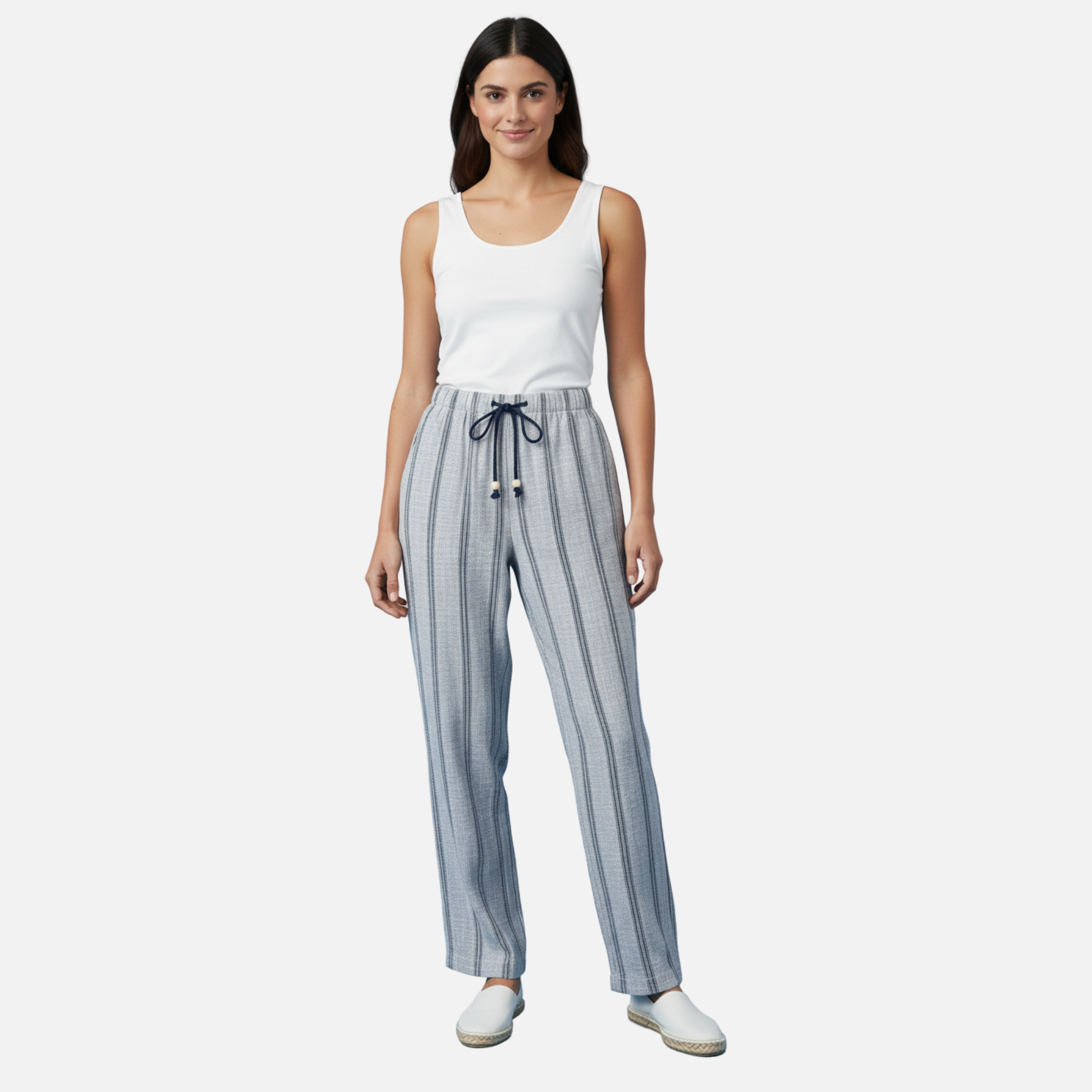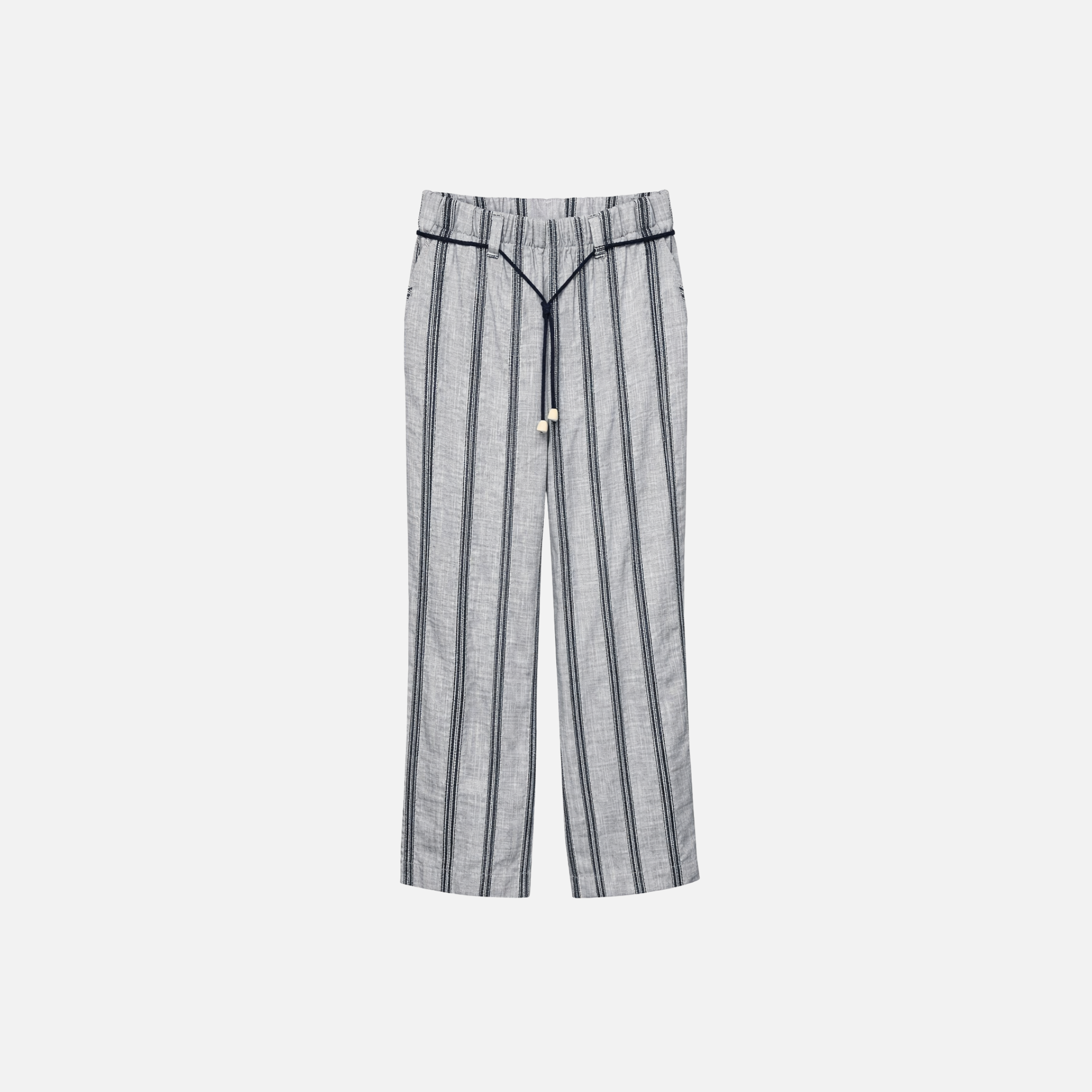 Pantalón recto de color azul y blanco jaspeado y rayas de color azul y blanco. Tiene trabillas en toda la cintura y en las trabillas tiene un cordón.