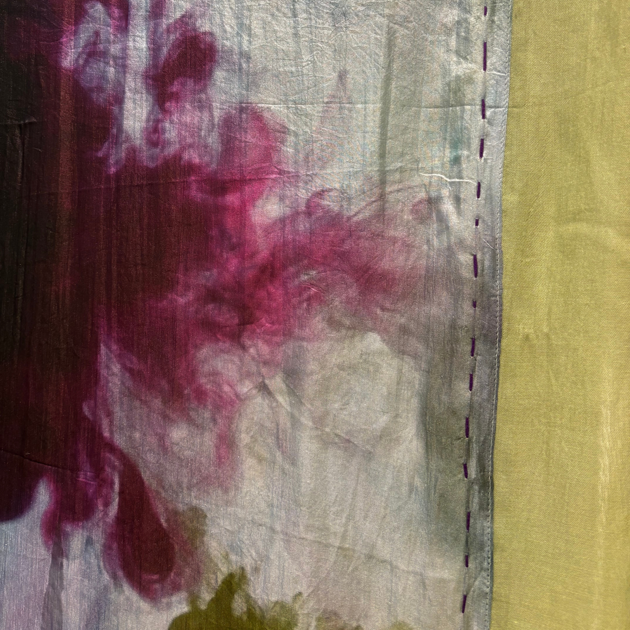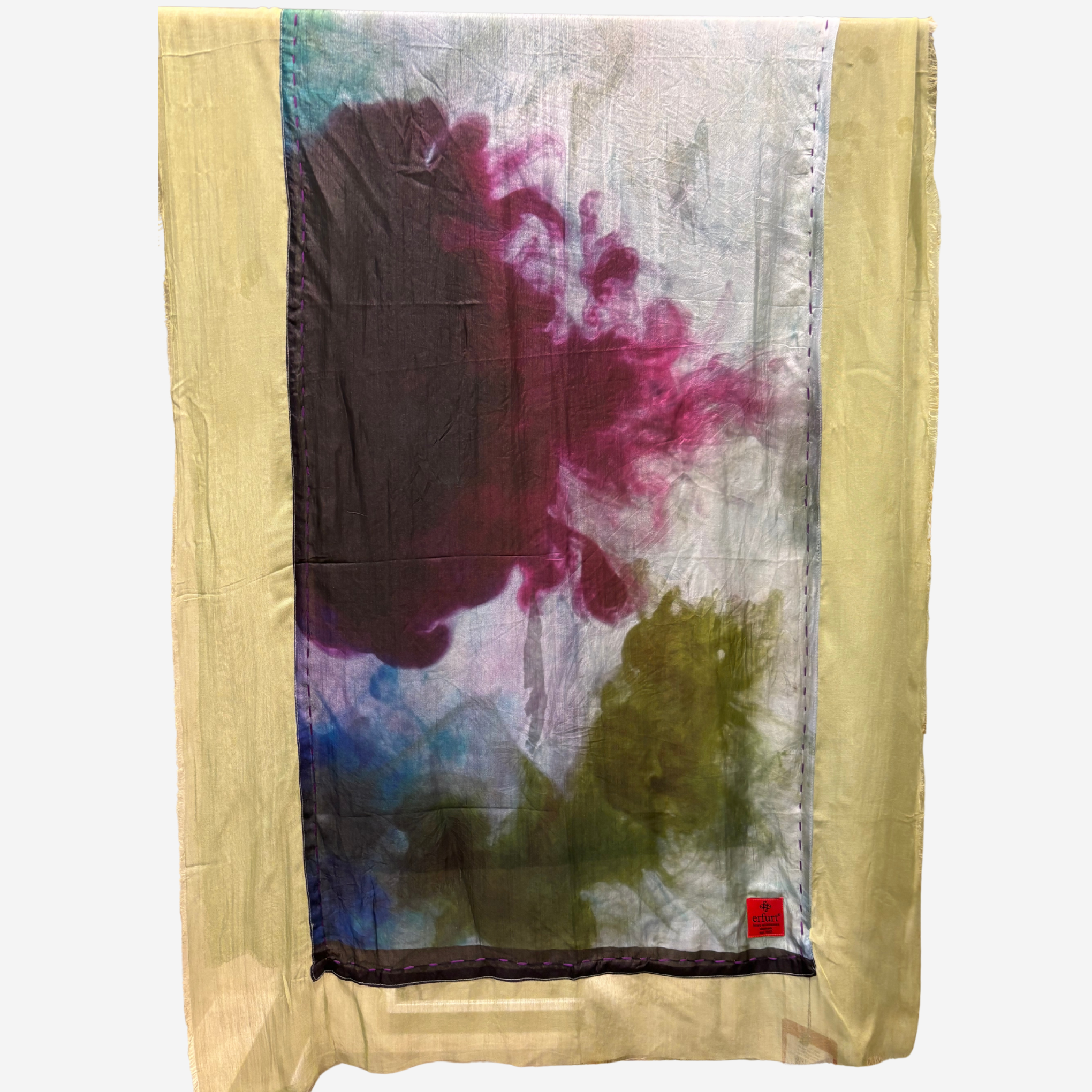 Pañuelo rectangular largo en tonos verde, morado y azules. Es de Erfurt.