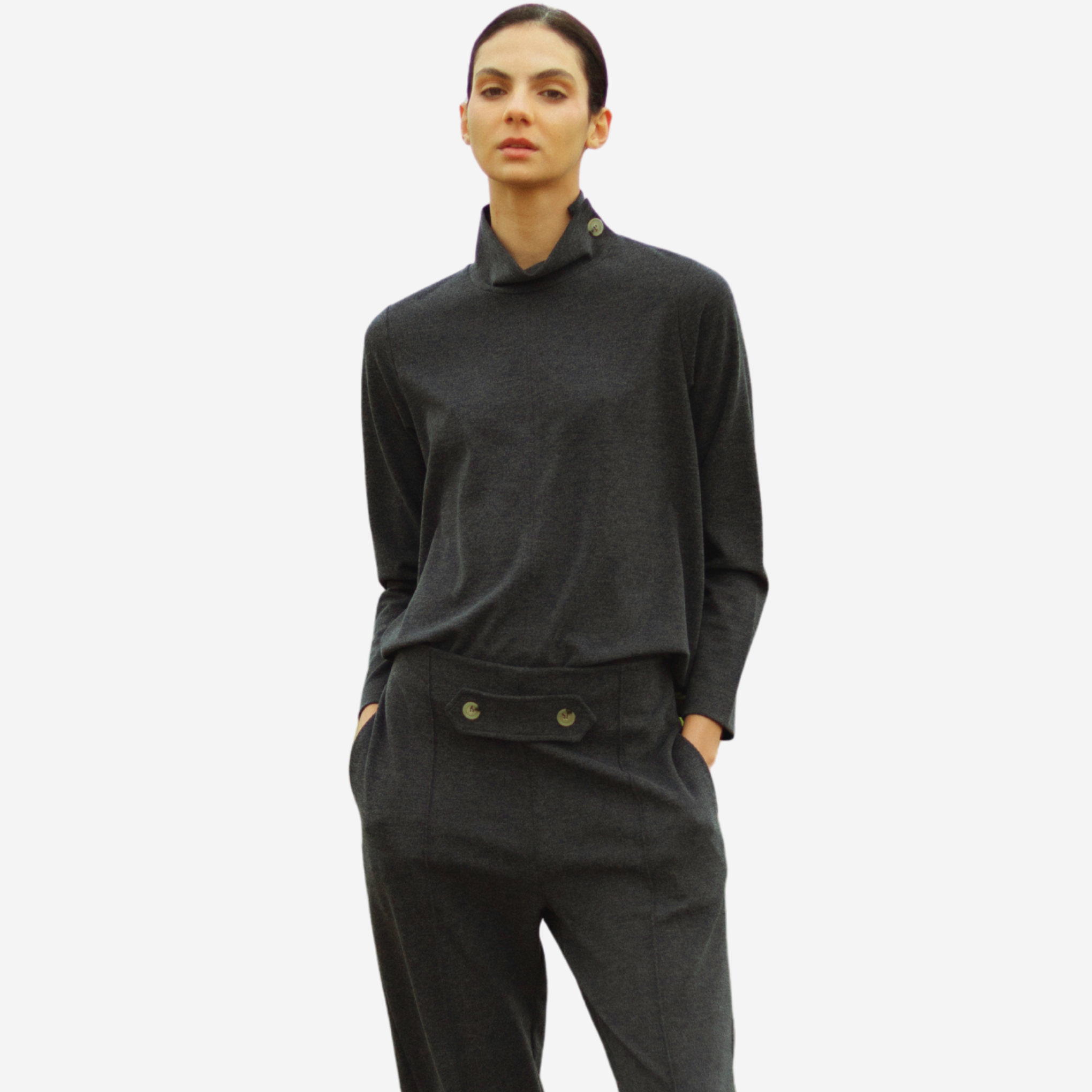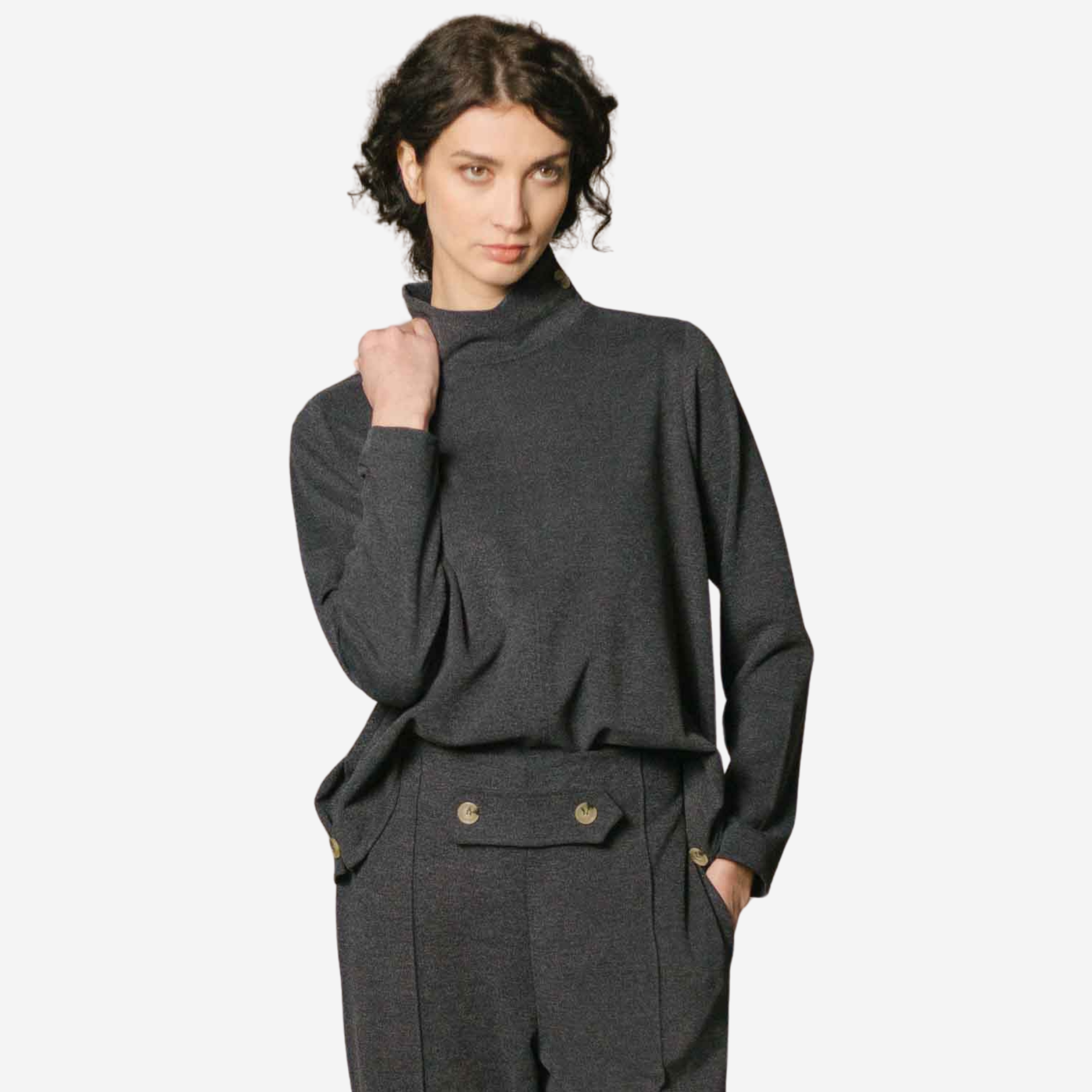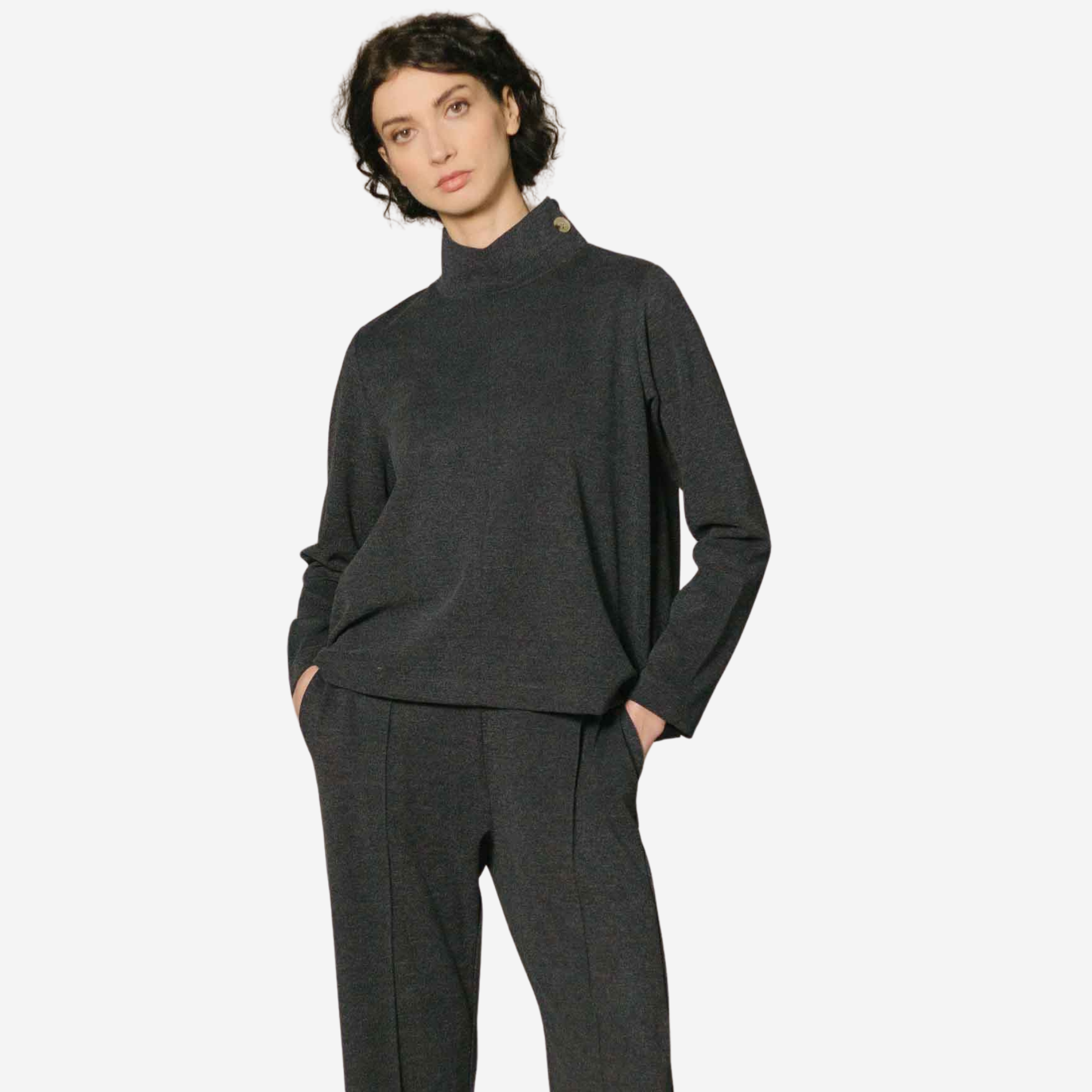 Sudadera cuello alto con botón en el cuello y en los laterales del jersey debajo de todo. Manga larga.