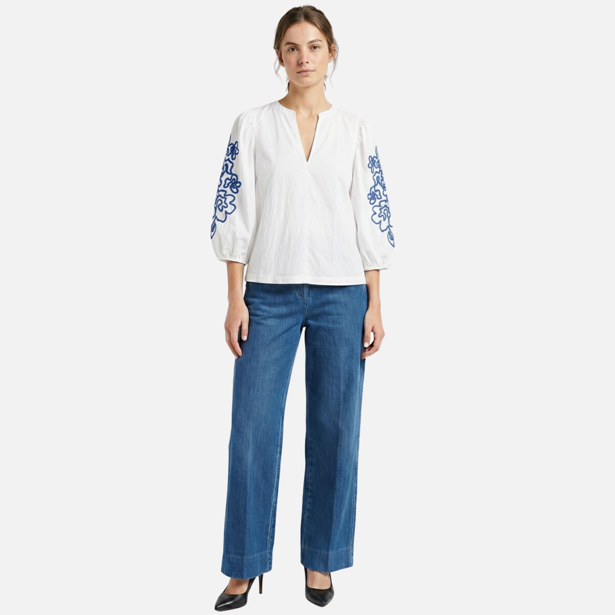 Pantalón vaquero ancho de cintura alta. Una pieza atemporal y elegante que combina perfectamente con cualquiera de nuestras partes de arriba.