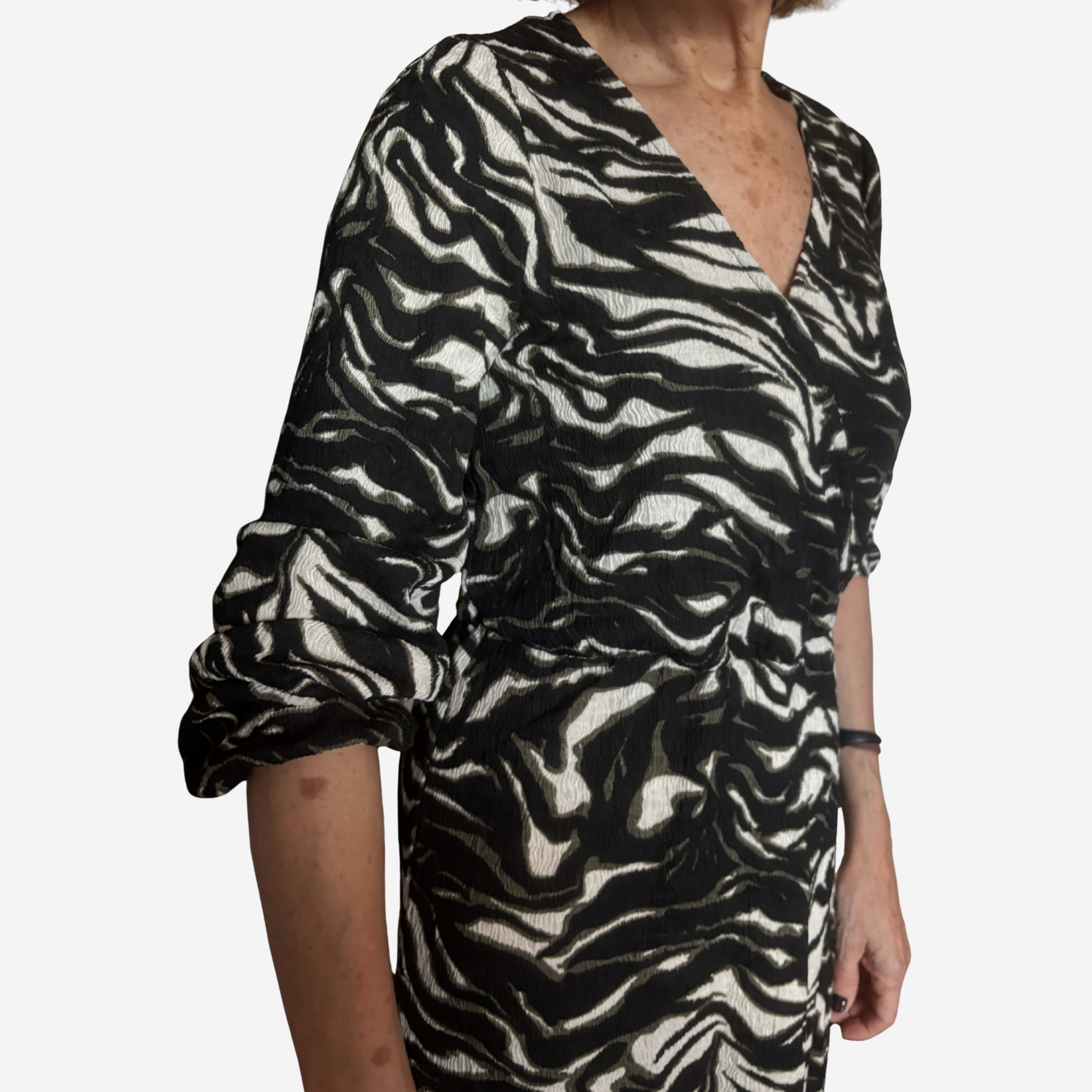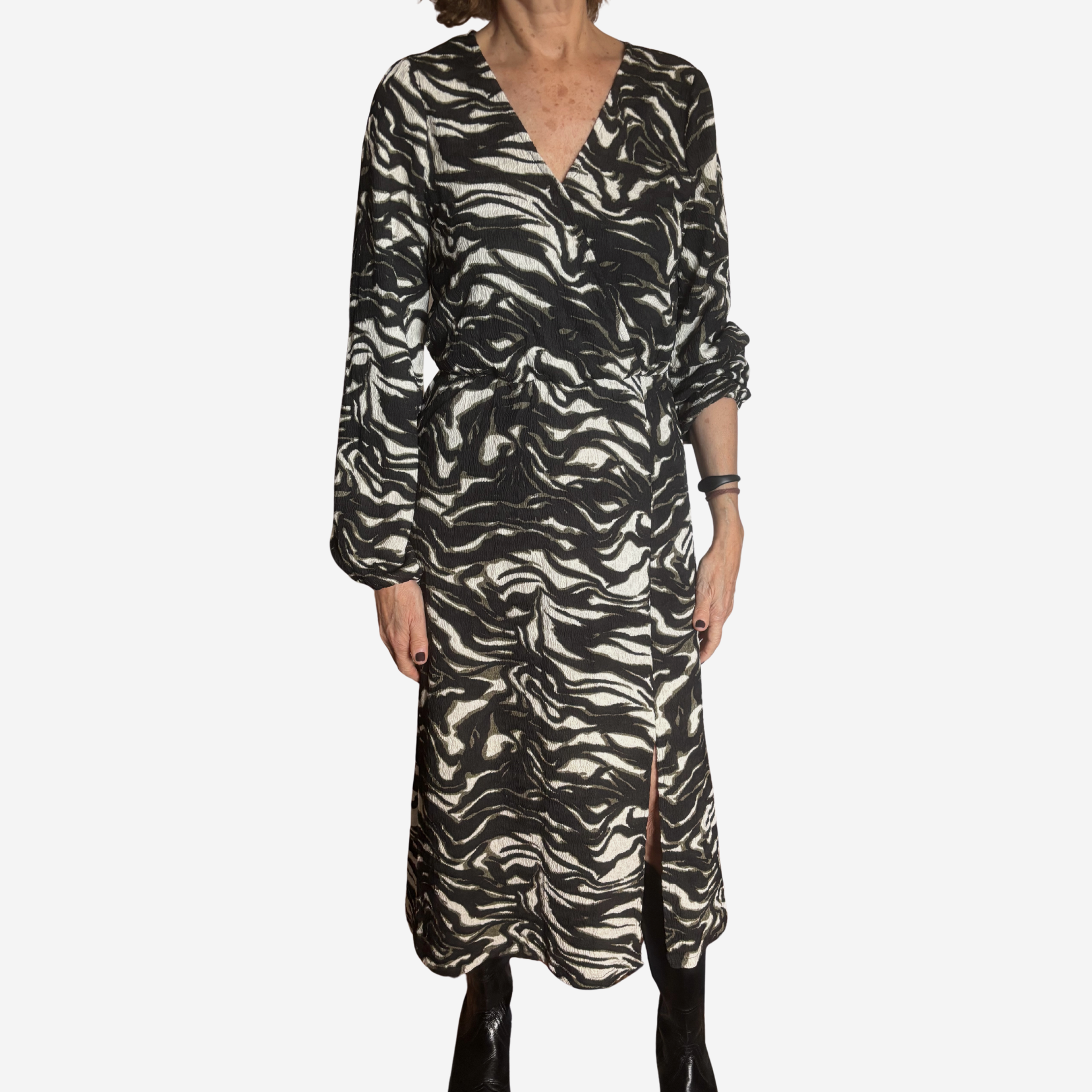 Vestido midi estampado tipo print cebra de color negro y crudo. Escote en V con corchete para cerrar y crucado a la altura del pecho. Manga con goma en el puño.Pequeña apertura en el lado izquierdo inferior. LAVAR Y PONER.